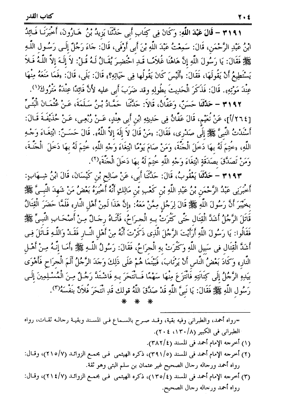 3191 - قَالَ عَبْدَ اللَّهِ: وَكَانَ فِى كِتَابِ أَبِى حَدَّثَنَا يَزِيدُ بْنُ هَارُونَ، أَخْبَرَنَا فَائِدُ ابْنُ عَبْدِ الرَّحْمَنِ، قَالَ: سَمِعْتُ عَبْدَ اللَّهِ بْنَ أَبِى أَوْفَى، قَالَ: جَاءَ رَجُلٌ إِلَى رَسُولِ اللَّهِ صلى الله عليه وسلم فَقَالَ: يَا رَسُولَ اللَّهِ إِنَّ هَاهُنَا غُلاَمًا قَدِ احْتُضِرَ يُقَالُ لَهُ قُلْ: لاَ إِلَهَ إِلاَّ اللَّهُ فَلاَ يَسْتَطِيعُ أَنْ يَقُولَهَا، فَقَالَ: أَلَيْسَ كَانَ يَقُولُها فِى حَيَاتِهِ؟ قَالَ: بَلَى، قَالَ: فَمَا مَنَعَهُ مِنْهَا عِنْدَ مَوْتِهِ. قَالَ: فَذَكَرَ الْحَدِيثَ بِطُولِهِ وقد ضَرَبَ أَبِى عليه لأَنَّ فَائِدًا عِنْدَهُ مَتْرُوكَ.