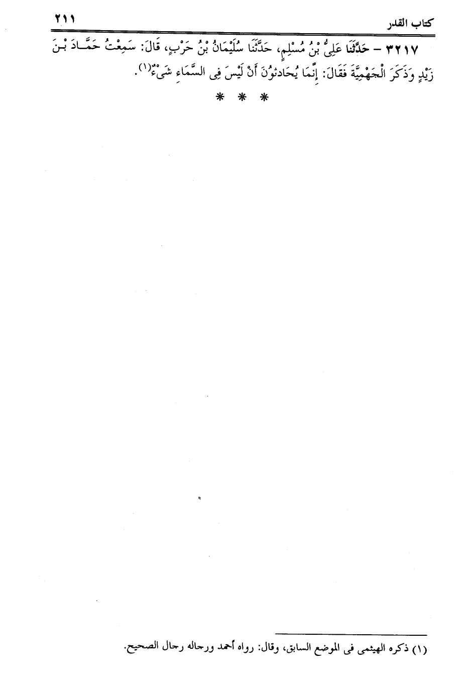 3217 - حَدَّثَنَا عَلِىُّ بْنُ مُسْلِمٍ، حَدَّثَنَا سُلَيْمَانُ بْنُ حَرْبٍ، قَالَ: سَمِعْتُ حَمَّادَ بْنَ زَيْدٍ وَذَكَرَ الْجَهْمِيَّةَ فَقَالَ: إِنَّمَا يُحَادثوُنَ أَنْ لَيْسَ فِى السَّمَاءِ شَىْءٌ.
