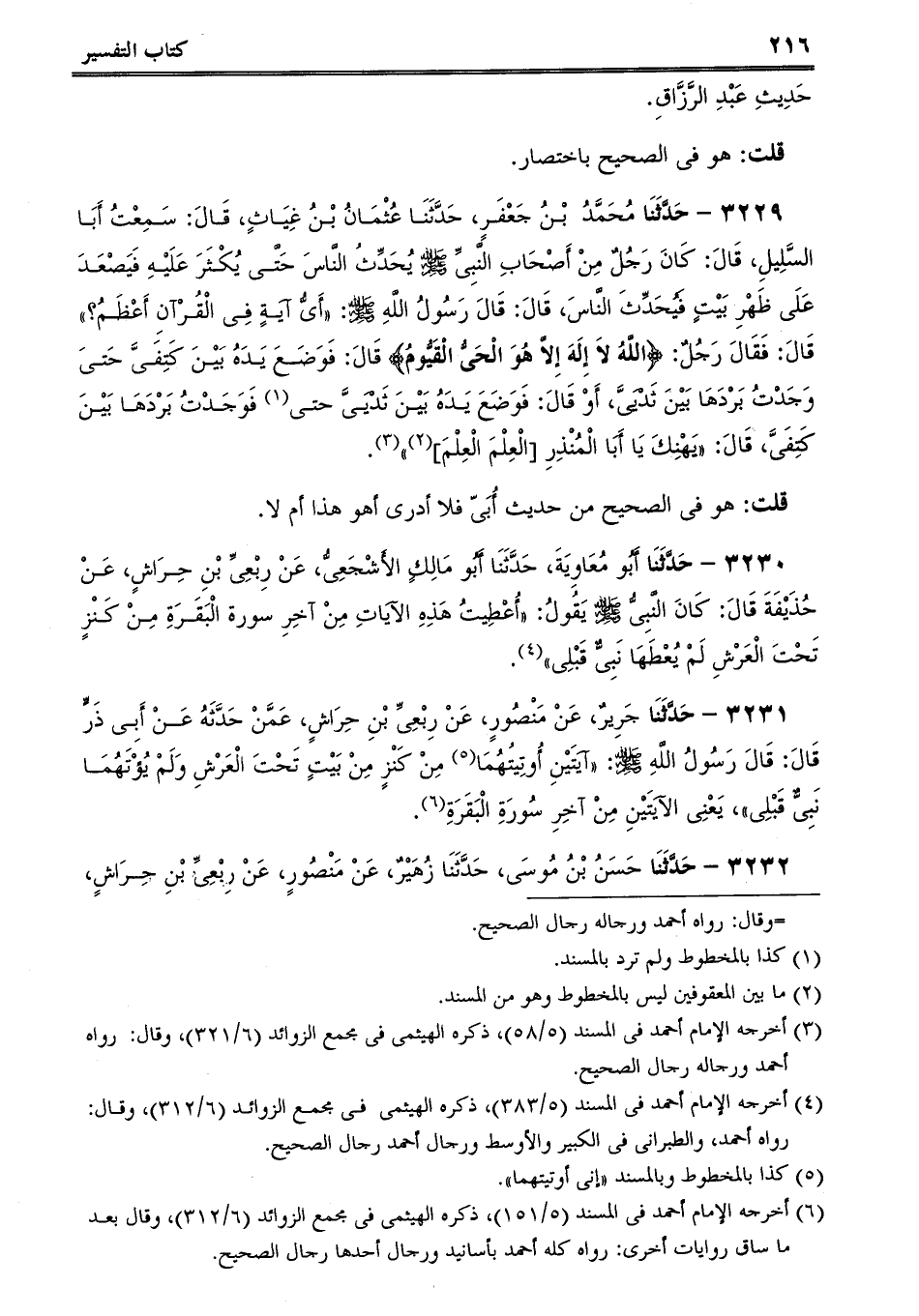 3230 - حَدَّثَنَا أَبُو مُعَاوِيَةَ، حَدَّثَنَا أَبُو مَالِكٍ الأَشْجَعِىُّ، عَنْ رِبْعِىِّ بْنِ حِرَاشٍ، عَنْ حُذَيْفَةَ قَالَ: كَانَ النَّبِىُّ صلى الله عليه وسلم يَقُولُ: أُعْطِيتُ هَذِهِ الآيَاتِ مِنْ آخِرِ سورة الْبَقَرَةِ مِنْ كَنْزٍ تَحْتَ الْعَرْشِ لَمْ يُعْطَهَا نَبِىٌّ قَبْلِى.