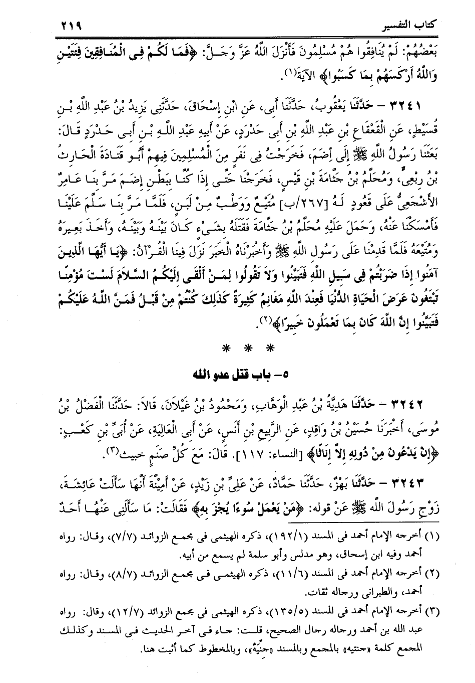 3241 - حَدَّثَنَا يَعْقُوبُ، حَدَّثَنَا أَبِى، عَنِ ابْنِ إِسْحَاقَ، حَدَّثَنِى يَزِيدُ بْنُ عَبْدِ اللَّهِ بْنِ قُسَيْطٍ، عَنِ الْقَعْقَاعِ بْنِ عَبْدِ اللَّهِ بْنِ أَبِى حَدْرَدٍ، عَنْ أَبِيهِ عَبْدِ اللَّهِ بْنِ أَبِى حَدْرَدٍ قَالَ: بَعَثَنَا رَسُولُ اللَّهِ صلى الله عليه وسلم إِلَى أِضَمَ، فَخَرَجْتُ فِى نَفَرٍ مِنَ الْمُسْلِمِينَ فِيهِمْ أَبُو قَتَادَةَ الْحَارِثُ بْنُ رِبْعِىٍّ، وَمُحَلَّمُ بْنُ جَثَّامَةَ بْنِ قَيْسٍ، فَخَرَجْنَا حَتَّى إِذَا كُنَّا بِبَطْنِ إِضَمَ مَرَّ بِنَا عَامِرٌ الأَشْجَعِىُّ عَلَى قَعُودٍ لَهُ مُتَيْعٌ وَوَطْبٌ مِنْ لَبَنٍ، فَلَمَّا مَرَّ بِنَا سَلَّمَ عَلَيْنَا فَأَمْسَكْنَا عَنْهُ، وَحَمَلَ عَلَيْهِ مُحَلَّمُ بْنُ جَثَّامَةَ فَقَتَلَهُ بِشَىْءٍ كَانَ بَيْنَهُ وَبَيْنَهُ، وَأَخَذَ بَعِيرَهُ وَمُتَيْعَهُ فَلَمَّا قَدِمْنَا عَلَى رَسُولِ اللَّهِ صلى الله عليه وسلم وَأَخْبَرْنَاهُ الْخَبَرَ نَزَلَ فِينَا الْقُرْآنُ: {يَا أَيُّهَا الَّذِينَ آمَنُوا إِذَا ضَرَبْتُمْ فِى سَبِيلِ اللَّهِ فَتَبَيَّنُوا وَلاَ تَقُولُوا لِمَنْ أَلْقَى إِلَيْكُمُ السَّلاَمَ لَسْتَ مُؤْمِنًا تَبْتَغُونَ عَرَضَ الْحَيَاةِ الدُّنْيَا فَعِنْدَ اللَّهِ مَغَانِمُ كَثِيرَةٌ كَذَلِكَ كُنْتُمْ مِنْ قَبْلُ فَمَنَّ اللَّهُ عَلَيْكُمْ فَتَبَيَّنُوا إِنَّ اللَّهَ كَانَ بِمَا تَعْمَلُونَ خَبِيرًا} .
