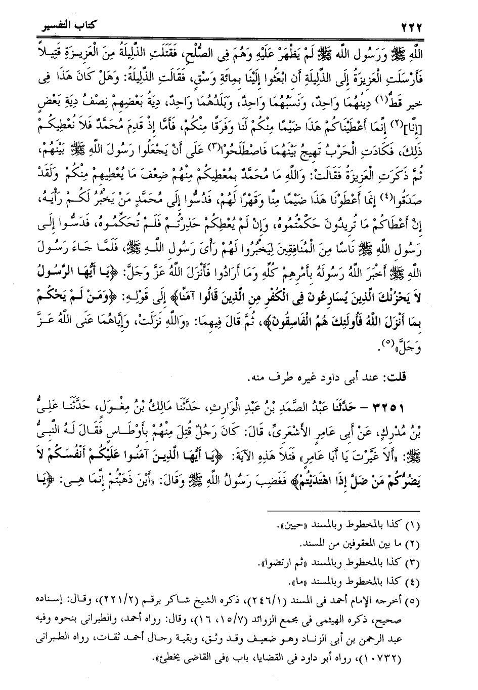 3251 - حَدَّثَنَا عَبْدُ الصَّمَدِ بْنُ عَبْدِ الْوَارِثِ، حَدَّثَنَا مَالِكُ بْنُ مِغْوَلٍ، حَدَّثَنَا عَلِىُّ بْنُ مُدْرِكٍ، عَنْ أَبِى عَامِرٍ الأَشْعَرِىِّ، قَالَ: كَانَ رَجُلٌ قُتِلَ مِنْهُمْ بِأَوْطَاسٍ فَقَالَ لَهُ النَّبِىُّ صلى الله عليه وسلم: أَلاَ غَيَّرْتَ يَا أَبَا عَامِرٍ فَتَلاَ هَذِهِ الآيَةَ: {يَا أَيُّهَا الَّذِينَ آمَنُوا عَلَيْكُمْ أَنْفُسَكُمْ لاَ يَضُرُّكُمْ مَنْ ضَلَّ إِذَا اهْتَدَيْتُمْ} فَغَضِبَ رَسُولُ اللَّهِ صلى الله عليه وسلم وَقَالَ: أَيْنَ ذَهَبْتُمْ إِنَّمَا هِى: {يَا -[223]- أَيُّهَا الَّذِينَ آمَنُوا لاَ يَضُرُّكُمْ مَنْ ضَلَّ مِنَ الْكُفَّارِ [إِذَا اهْتَدَيْتُمْ] } .