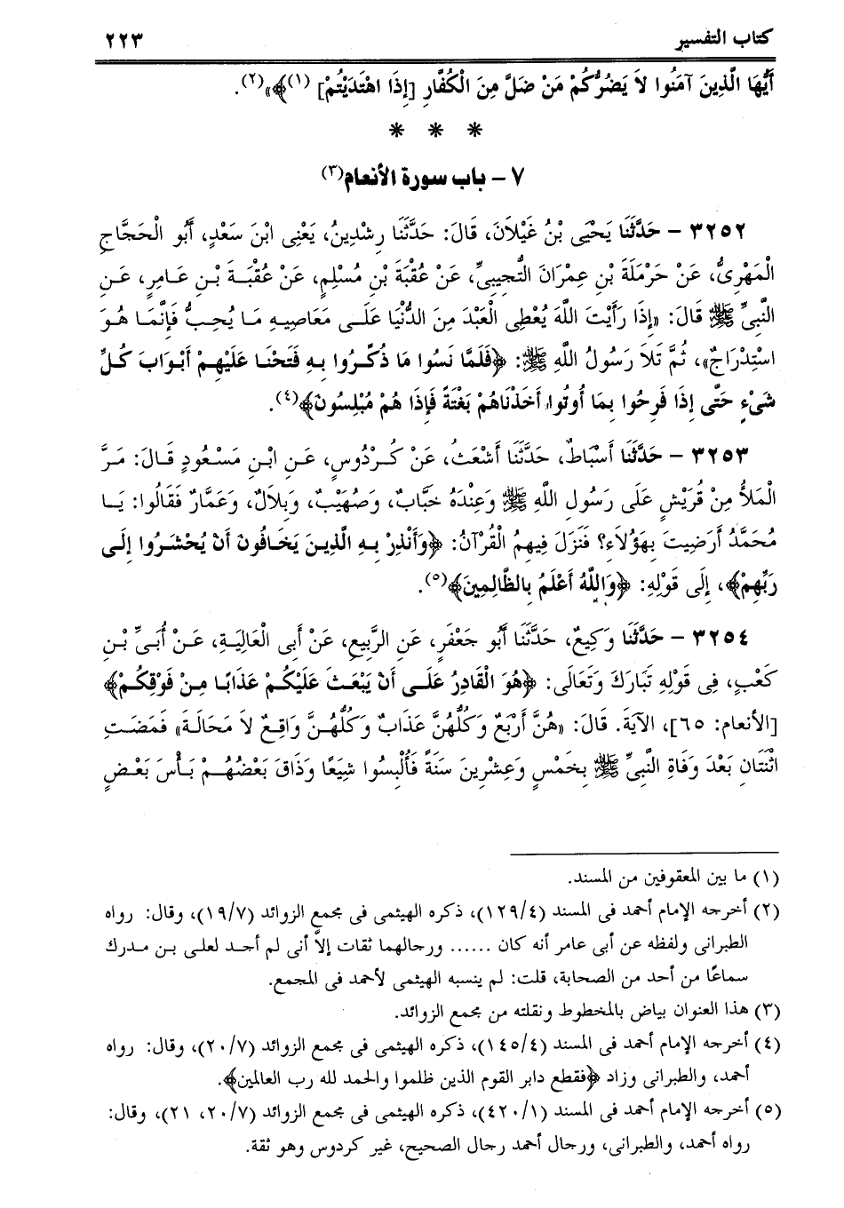 3253 - حَدَّثَنَا أَسْبَاطٌ، حَدَّثَنَا أَشْعَثُ، عَنْ كُرْدُوسٍ، عَنِ ابْنِ مَسْعُودٍ قَالَ: مَرَّ الْمَلأُ مِنْ قُرَيْشٍ عَلَى رَسُولِ اللَّهِ صلى الله عليه وسلم وَعِنْدَهُ خَبَّابٌ، وَصُهَيْبٌ، وَبِلاَلٌ، وَعَمَّارٌ فَقَالُوا: يَا مُحَمَّدُ أَرَضِيتَ بِهَؤُلاَءِ؟ فَنَزَلَ فِيهِمُ الْقُرْآنُ: {وَأَنْذِرْ بِهِ الَّذِينَ يَخَافُونَ أَنْ يُحْشَرُوا إِلَى رَبِّهِمْ} ، إِلَى قَوْلِهِ: {وَاللَّهُ أَعْلَمُ بِالظَّالِمِينَ} .