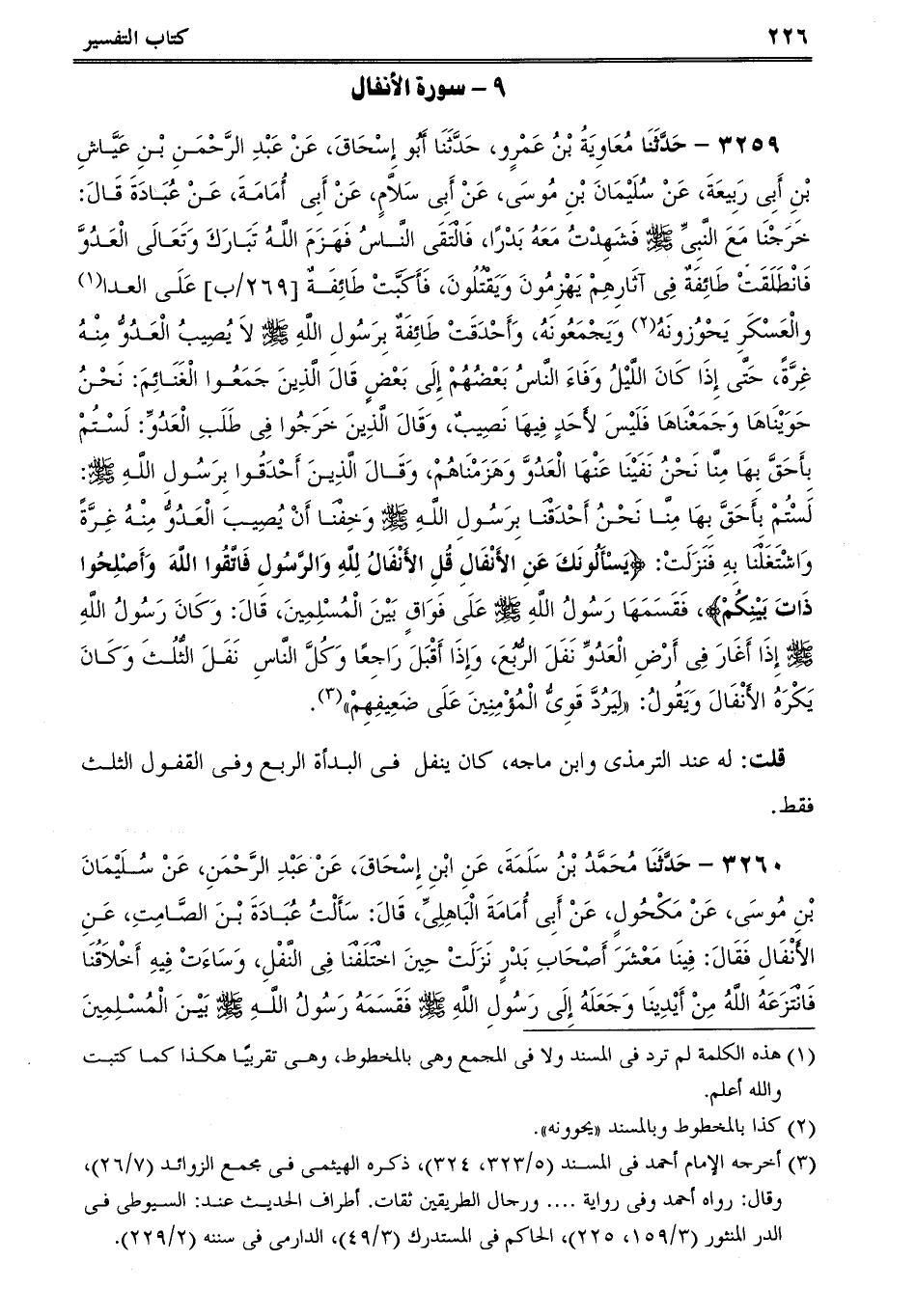 3259 - حَدَّثَنَا مُعَاوِيَةُ بْنُ عَمْرٍو، حَدَّثَنَا أَبُو إِسْحَاقَ، عَنْ عَبْدِ الرَّحْمَنِ بْنِ عَيَّاشِ بْنِ أَبِى رَبِيعَةَ، عَنْ سُلَيْمَانَ بْنِ مُوسَى، عَنْ أَبِى سَلاَّمٍ، عَنْ أَبِى أُمَامَةَ، عَنْ عُبَادَةَ قَالَ: خَرَجْنَا مَعَ النَّبِىِّ صلى الله عليه وسلم فَشَهِدْتُ مَعَهُ بَدْرًا، فَالْتَقَى النَّاسُ فَهَزَمَ اللَّهُ تَبَارَكَ وَتَعَالَى الْعَدُوَّ فَانْطَلَقَتْ طَائِفَةٌ فِى آثَارِهِمْ يَهْزِمُونَ وَيَقْتُلُونَ، فَأَكَبَّتْ طَائِفَةٌ عَلَى العدا والْعَسْكَرِ يَحْوُزونَهُ وَيَجْمَعُونَهُ، وَأَحْدَقَتْ طَائِفَةٌ بِرَسُولِ اللَّهِ صلى الله عليه وسلم لاَ يُصِيبُ الْعَدُوُّ مِنْهُ غِرَّةً، حَتَّى إِذَا كَانَ اللَّيْلُ وَفَاءَ النَّاسُ بَعْضُهُمْ إِلَى بَعْضٍ قَالَ الَّذِينَ جَمَعُوا الْغَنَائِمَ: نَحْنُ حَوَيْنَاهَا وَجَمَعْنَاهَا فَلَيْسَ لأَحَدٍ فِيهَا نَصِيبٌ، وَقَالَ الَّذِينَ خَرَجُوا فِى طَلَبِ الْعَدُوِّ: لَسْتُمْ بِأَحَقَّ بِهَا مِنَّا نَحْنُ نَفَيْنَا عَنْهَا الْعَدُوَّ وَهَزَمْنَاهُمْ، وَقَالَ الَّذِينَ أَحْدَقُوا بِرَسُولِ اللَّهِ صلى الله عليه وسلم: لَسْتُمْ بِأَحَقَّ بِهَا مِنَّا نَحْنُ أَحْدَقْنَا بِرَسُولِ اللَّهِ صلى الله عليه وسلم وَخِفْنَا أَنْ يُصِيبَ الْعَدُوُّ مِنْهُ غِرَّةً وَاشْتَغَلْنَا بِهِ فَنَزَلَتْ: {يَسْأَلُونَكَ عَنِ الأَنْفَالِ قُلِ الأَنْفَالُ لِلَّهِ وَالرَّسُولِ فَاتَّقُوا اللَّهَ وَأَصْلِحُوا ذَاتَ بَيْنِكُمْ} ، فَقَسَمَهَا رَسُولُ اللَّهِ صلى الله عليه وسلم عَلَى فَوَاقٍ بَيْنَ الْمُسْلِمِينَ، قَالَ: وَكَانَ رَسُولُ اللَّهِ صلى الله عليه وسلم إِذَا أَغَارَ فِى أَرْضِ الْعَدُوِّ نَفَلَ الرُّبُعَ، وَإِذَا أَقْبَلَ رَاجِعًا وَكُلَّ النَّاسِ نَفَلَ الثُّلُثَ وَكَانَ يَكْرَهُ الأَنْفَالَ وَيَقُولُ: لِيَرُدَّ قَوِىُّ الْمُؤْمِنِينَ عَلَى ضَعِيفِهِمْ.