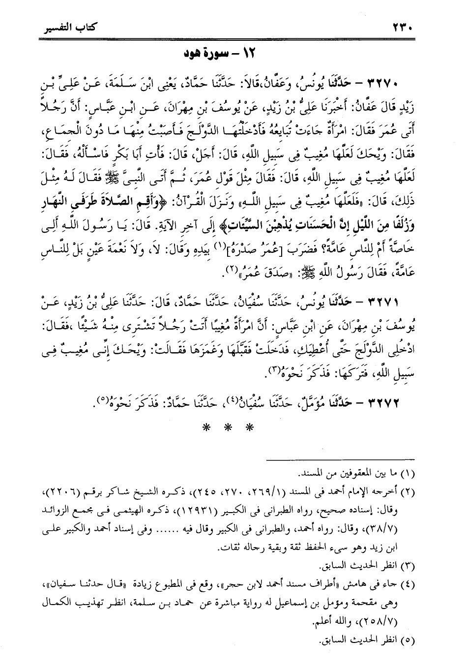 3270 - حَدَّثَنَا يُونُسُ، وَعَفَّانُ، قَالاَ: حَدَّثَنَا حَمَّادٌ، يَعْنِى ابْنَ سَلَمَةَ، عَنْ عَلِىِّ بْنِ زَيْدٍ قَالَ عَفَّانُ: أَخْبَرَنَا عَلِىُّ بْنُ زَيْدٍ، عَنْ يُوسُفَ بْنِ مِهْرَانَ، عَنِ ابْنِ عَبَّاسٍ: أَنَّ رَجُلاً أَتَى عُمَرَ فَقَالَ: امْرَأَةٌ جَاءَتْ تُبَايِعُهُ فَأَدْخَلْتُهَا الدَّوْلَجَ فَأَصَبْتُ مِنْهَا مَا دُونَ الْجِمَاعِ، فَقَالَ: وَيْحَكَ لَعَلَّهَا مُغِيبٌ فِى سَبِيلِ اللَّهِ، قَالَ: أَجَلْ، قَالَ: فَأْتِ أَبَا بَكْرٍ فَاسْأَلْهُ، فَقَالَ: لَعَلَّهَا مُغِيبٌ فِى سَبِيلِ اللَّهِ، قَالَ: فَقَالَ مِثْلَ قَوْلِ عُمَرَ، ثُمَّ أَتَى النَّبِىَّ صلى الله عليه وسلم فَقَالَ لَهُ مِثْلَ ذَلِكَ، قَالَ: فَلَعَلَّهَا مُغِيبٌ فِى سَبِيلِ اللَّهِ وَنَزَلَ الْقُرْآنُ: {وَأَقِمِ الصَّلاَةَ طَرَفَىِ النَّهَارِ وَزُلَفًا مِنَ اللَّيْلِ إِنَّ الْحَسَنَاتِ يُذْهِبْنَ السَّيِّئَاتِ} إِلَى آخِرِ الآيَةِ. قَالَ: يَا رَسُولَ اللَّهِ أَلِى خَاصَّةً أَمْ لِلنَّاسِ عَامَّةً؟ فَضَرَبَ [عُمَرُ صَدْرَهُ] بِيَدِهِ وَقَالَ: لاَ، وَلاَ نَعْمَةَ عَيْنٍ بَلْ لِلنَّاسِ عَامَّةً، فَقَالَ رَسُولُ اللَّهِ صلى الله عليه وسلم: صَدَقَ عُمَرُ.