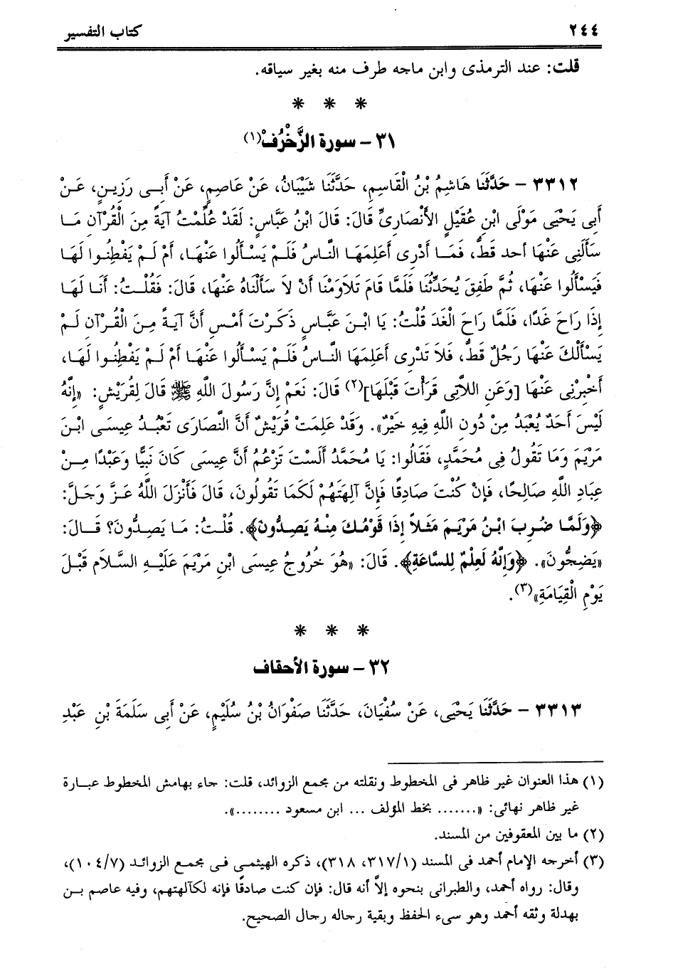 3312 - حَدَّثَنَا هَاشِمُ بْنُ الْقَاسِمِ، حَدَّثَنَا شَيْبَانُ، عَنْ عَاصِمٍ، عَنْ أَبِى رَزِينٍ، عَنْ أَبِى يَحْيَى مَوْلَى ابْنِ عُقَيْلٍ الأَنْصَارِىِّ قَالَ: قَالَ ابْنُ عَبَّاسٍ: لَقَدْ عُلِّمْتُ آيَةً مِنَ الْقُرْآنِ مَا سَأَلَنِى عَنْهَا أحد قَطُّ، فَمَا أَدْرِى أَعَلِمَهَا النَّاسُ فَلَمْ يَسْأَلُوا عَنْهَا، أَمْ لَمْ يَفْطِنُوا لَهَا فَيَسْأَلُوا عَنْهَا، ثُمَّ طَفِقَ يُحَدِّثُنَا فَلَمَّا قَامَ تَلاَوَمْنَا أَنْ لاَ سَأَلْنَاهُ عَنْهَا، قَالَ: فَقُلْتُ: أَنَا لَهَا إِذَا رَاحَ غَدًا، فَلَمَّا رَاحَ الْغَدَ قُلْتُ: يَا ابْنَ عَبَّاسٍ ذَكَرْتَ أَمْسِ أَنَّ آيَةً مِنَ الْقُرْآنِ لَمْ يَسْأَلْكَ عَنْهَا رَجُلٌ قَطُّ، فَلاَ تَدْرِى أَعَلِمَهَا النَّاسُ فَلَمْ يَسْأَلُوا عَنْهَا أَمْ لَمْ يَفْطِنُوا لَهَا، أَخْبِرْنِى عَنْهَا [وَعَنِ اللاَّتِى قَرَأْتَ قَبْلَهَا] قَالَ: نَعَمْ إِنَّ رَسُولَ اللَّهِ صلى الله عليه وسلم قَالَ لِقُرَيْشٍ: إِنَّهُ لَيْسَ أَحَدٌ يُعْبَدُ مِنْ دُونِ اللَّهِ فِيهِ خَيْرٌ. وَقَدْ عَلِمَتْ قُرَيْشٌ أَنَّ النَّصَارَى تَعْبُدُ عِيسَى ابْنَ مَرْيَمَ وَمَا تَقُولُ فِى مُحَمَّدٍ، فَقَالُوا: يَا مُحَمَّدُ أَلَسْتَ تَزْعُمُ أَنَّ عِيسَى كَانَ نَبِيًّا وَعَبْدًا مِنْ عِبَادِ اللَّهِ صَالِحًا، فَإنْ كُنْتَ صَادِقًا فَإِنَّ آلِهَتَهُمْ لَكَمَا تَقُولُونَ، قَالَ فَأَنْزَلَ اللَّهُ عَزَّ وَجَلَّ: {وَلَمَّا ضُرِبَ ابْنُ مَرْيَمَ مَثَلاً إِذَا قَوْمُكَ مِنْهُ يَصِدُّونَ} . قُلْتُ: مَا يَصِدُّونَ؟ قَالَ: يَضِجُّونَ. {وَإِنَّهُ لَعِلْمٌ لِلسَّاعَةِ} . قَالَ: هُوَ خُرُوجُ عِيسَى ابْنِ مَرْيَمَ عَلَيْهِ السَّلاَم قَبْلَ يَوْمِ الْقِيَامَةِ.