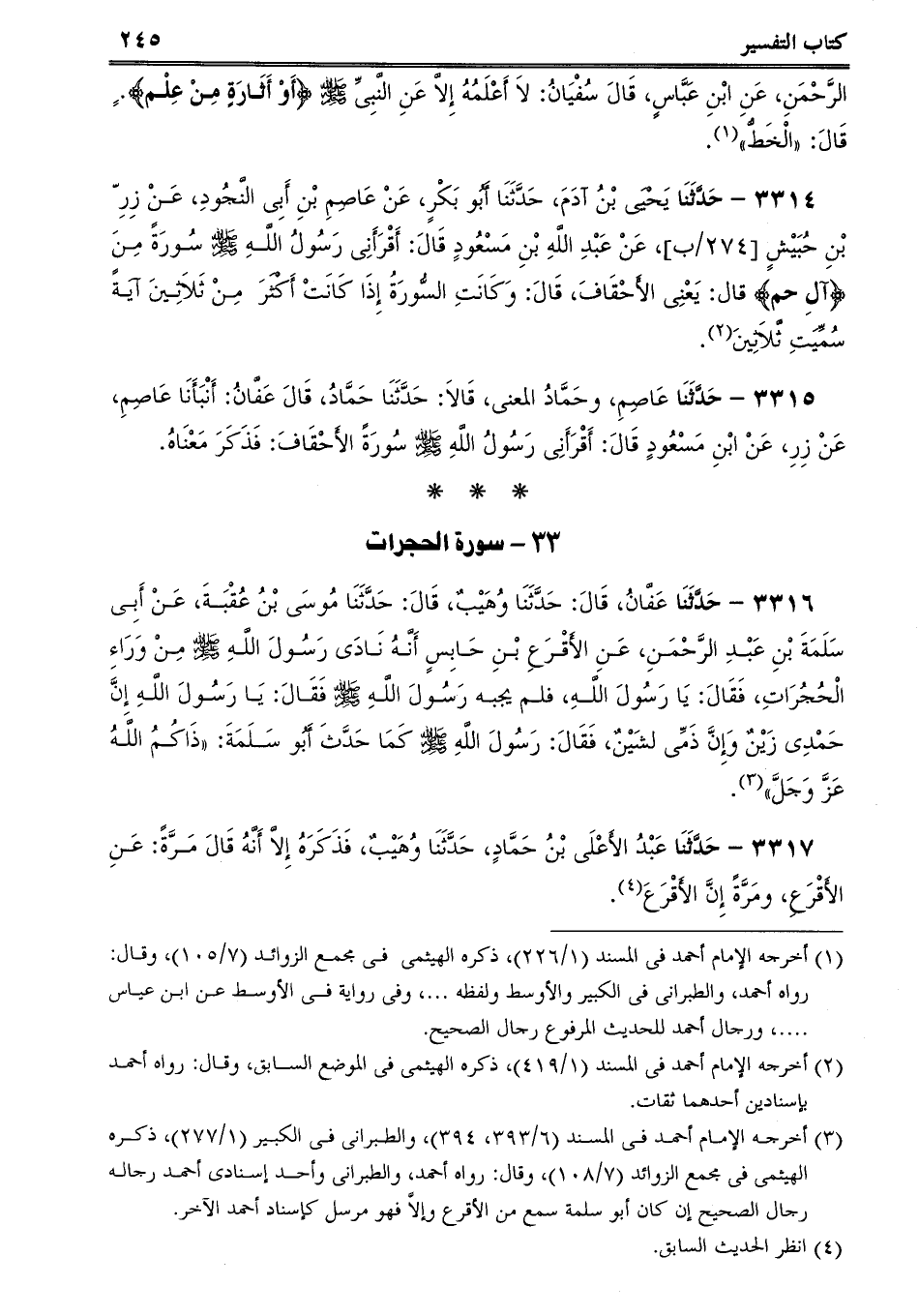 3314 - حَدَّثَنَا يَحْيَى بْنُ آدَمَ، حَدَّثَنَا أَبُو بَكْرٍ، عَنْ عَاصِمِ بْنِ أَبِى النَّجُودِ، عَنْ زِرِّ بْنِ حُبَيْشٍ، عَنْ عَبْدِ اللَّهِ بْنِ مَسْعُودٍ قَالَ: أَقْرَأَنِى رَسُولُ اللَّهِ صلى الله عليه وسلم سُورَةً مِنَ {آلِ حم} قال: يَعْنِى الأَحْقَافَ، قَالَ: وَكَانَتِ السُّورَةُ إِذَا كَانَتْ أَكْثَرَ مِنْ ثَلاَثِينَ آيَةً سُمِّيَتِ ثَّلاَثِينَ.