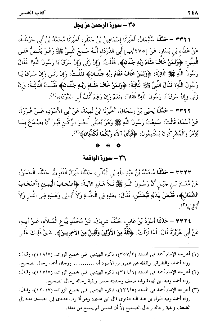 3321 - حَدَّثَنَا سُلَيْمَانُ، أَخْبَرَنَا إِسْمَاعِيلُ بْنُ جَعْفَرٍ، أَخْبَرَنَا مُحَمَّدُ بْنُ أَبِى حَرْمَلَةَ، عَنْ عَطَاءِ بْنِ يَسَارٍ، عَنْ أَبِى الدَّرْدَاءِ أَنَّهُ سَمِعَ النَّبِىَّ صلى الله عليه وسلم وَهُوَ يَقُصُّ عَلَى الْمِنْبَرِ: {وَلِمَنْ خَافَ مَقَامَ رَبِّهِ جَنَّتَانِ} . فَقُلْتُ: وَإِنْ زَنَى وَإِنْ سَرَقَ يَا رَسُولَ اللَّهِ؟ فَقَالَ رَسُولُ اللَّهِ صلى الله عليه وسلم الثَّانِيَةَ: {وَلِمَنْ خَافَ مَقَامَ رَبِّهِ جَنَّتَانِ} فَقُلْتُ: وَإِنْ زَنَى وَإِنْ سَرَقَ يَا رَسُولَ اللَّهِ؟ فَقَالَ النَّبِىُّ صلى الله عليه وسلم الثَّالِثَةَ: {وَلِمَنْ خَافَ مَقَامَ رَبِّهِ جَنَّتَانِ} فَقُلْتُ الثَّالِثَةَ: وَإِنْ زَنَى وَإِنْ سَرَقَ يَا رَسُولَ اللَّهِ؟ فَقَالَ: نَعَمْ وَإِنْ رَغِمَ أَنْفُ أَبِى الدَّرْدَاءِ.