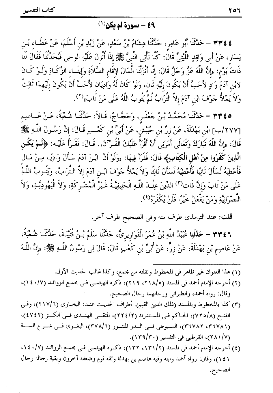 3345 - حَدَّثَنَا مُحَمَّدُ بْنُ جَعْفَرٍ، وَحَجَّاجٌ، قَالاَ: حَدَّثَنَا شُعْبَةُ، عَنْ عَاصِمِ ابْنِ بَهْدَلَةَ، عَنْ زِرِّ بْنِ حُبَيْشٍ، عَنْ أُبَىِّ بْنِ كَعْبٍ قَالَ: إِنَّ رَسُولَ اللَّهِ صلى الله عليه وسلم قَالَ: إِنَّ اللَّهَ تَبَارَكَ وَتَعَالَى أَمَرَنِى أَنْ أَقْرَأَ عَلَيْكَ الْقُرْآنَ. قَالَ: فَقَرَأَ عَلَيْه: {لَمْ يَكُنِ الَّذِينَ كَفَرُوا مِنْ أَهْلِ الْكِتَابِ} قَالَ: فَقَرَأَ فِيهَا: وَلَوْ أَنَّ ابْنَ آدَمَ سَأَلَ وَادِيًا مِنْ مَالٍ فَأُعْطِيَهُ لَسَأَلَ ثَانِيًا فَأُعْطِيَهُ لَسَأَلَ ثَالِثًا وَلاَ يَمْلأُ جَوْفَ ابْنِ آدَمَ إِلاَّ التُّرَابُ، وَيَتُوبُ اللَّهُ عَلَى مَنْ تَابَ وَإِنَّ ذَات الدِّينَ عِنْدَ اللَّهِ الْحَنِيفِيَّةُ غَيْرُ الْمُشْرِكَةِ، وَلاَ الْيَهُودِيَّةِ، وَلاَ النَّصْرَانِيَّةِ وَمَنْ يَفْعَلْ خَيْرًا فَلَنْ يُكْفَرَهُ.