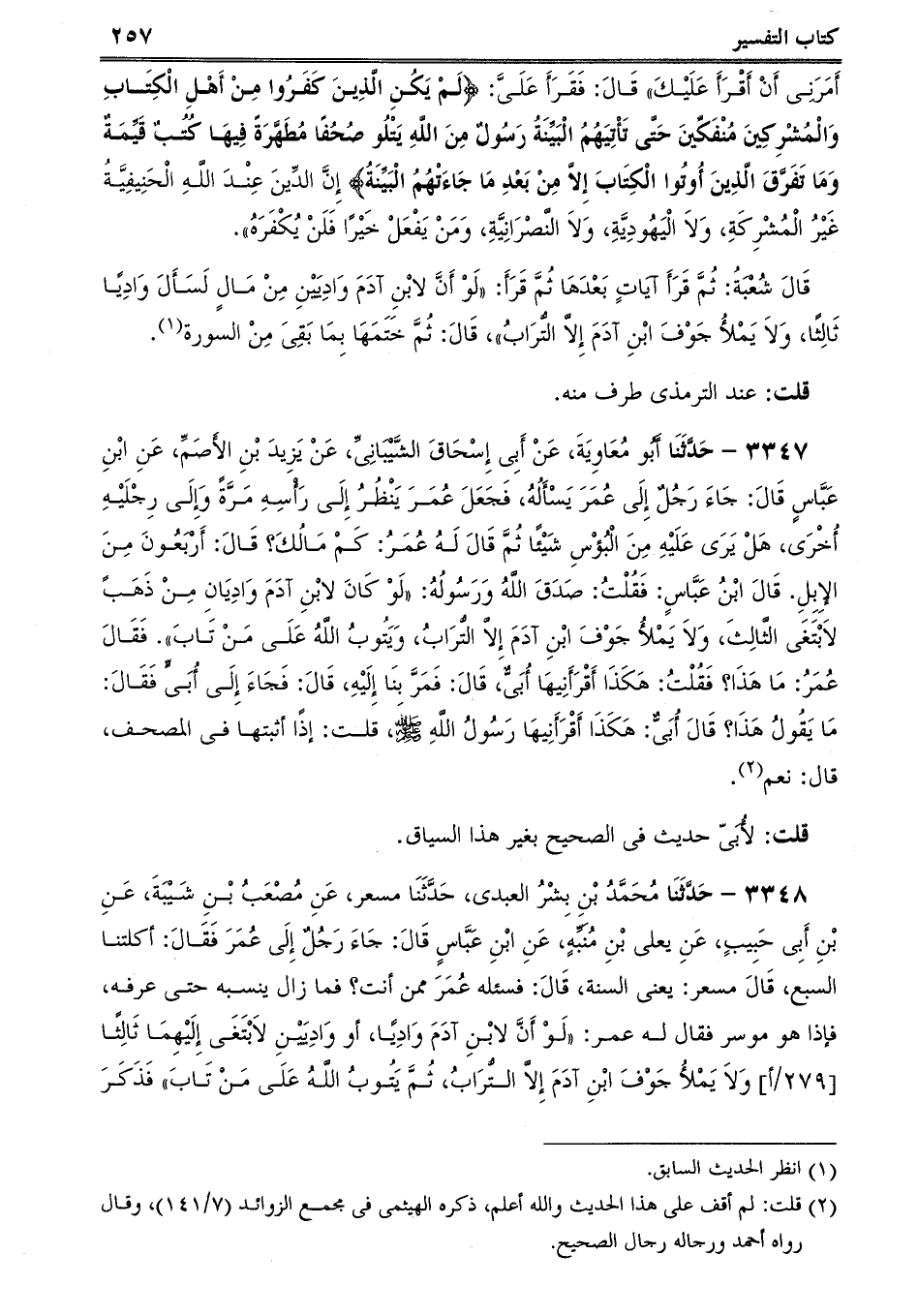 3347 - حَدَّثَنَا أَبُو مُعَاوِيَةَ، عَنْ أَبِى إِسْحَاقَ الشَّيْبَانِىِّ، عَنْ يَزِيدَ بْنِ الأَصَمِّ، عَنِ ابْنِ عَبَّاسٍ قَالَ: جَاءَ رَجُلٌ إِلَى عُمَرَ يَسْأَلُهُ، فَجَعَلَ عُمَرَ يَنْظُرُ إِلَى رَأْسِهِ مَرَّةً وَإِلَى رِجْلَيْهِ أُخْرَى، هَلْ يَرَى عَلَيْهِ مِنَ الْبُؤْسِ شَيْئًا ثُمَّ قَالَ لَهُ عُمَرُ: كَمْ مَالُكَ؟ قَالَ: أَرْبَعُونَ مِنَ الإِبِلِ. قَالَ ابْنُ عَبَّاسٍ: فَقُلْتُ: صَدَقَ اللَّهُ وَرَسُولُهُ: لَوْ كَانَ لابْنِ آدَمَ وَادِيَانِ مِنْ ذَهَبً لاَبْتَغَى الثَّالِثَ، وَلاَ يَمْلأُ جَوْفَ ابْنِ آدَمَ إِلاَّ التُّرَابُ، وَيَتُوبُ اللَّهُ عَلَى مَنْ تَابَ. فَقَالَ عُمَرُ: مَا هَذَا؟ فَقُلْتُ: هَكَذَا أَقْرَأَنِيهَا أُبَىٌّ، قَالَ: فَمَرَّ بِنَا إِلَيْهِ، قَالَ: فَجَاءَ إِلَى أُبَىٍّ فَقَالَ: مَا يَقُولُ هَذَا؟ قَالَ أُبَىٌّ: هَكَذَا أَقْرَأَنِيهَا رَسُولُ اللَّهِ صلى الله عليه وسلم، قلت: إذًا أثبتها فى المصحف، قال: نعم.