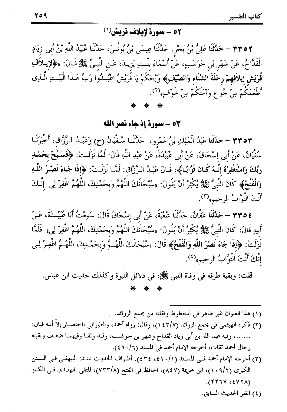 3352 - حَدَّثَنَا عَلِىُّ بْنُ بَحْرٍ، حَدَّثَنَا عِيسَى بْنُ يُونُسَ، حَدَّثَنَا عُبَيْدُ اللَّهِ بْنُ أَبِى زِيَادٍ الْقَدَّاحُ، عَنْ شَهْرِ بْنِ حَوْشَبٍ، عَنْ أَسْمَاءَ بِنْتِ يَزِيدَ، عَنِ النَّبِىِّ صلى الله عليه وسلم قَالَ: {لإِيلاَفِ قُرَيْشٍ إِيلاَفِهِمْ رِحْلَةَ الشِّتَاءِ وَالصَّيْفِ} وَيْحَكُمْ يَا قُرَيْشُ اعْبُدُوا رَبَّ هَذَا الْبَيْتِ الَّذِى أَطْعَمَكُمْ مِنْ جُوعٍ وَآمَنَكُمْ مِنْ خَوْفٍ.