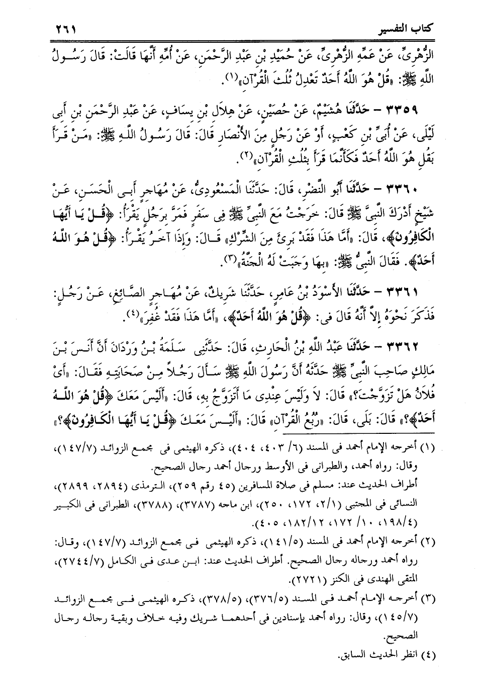 3360 - حَدَّثَنَا أَبُو النَّضْرِ، قَالَ: حَدَّثَنَا الْمَسْعُودِىُّ، عَنْ مُهَاجِرٍ أَبِى الْحَسَنِ، عَنْ شَيْخٍ أَدْرَكَ النَّبِىَّ صلى الله عليه وسلم قَالَ: خَرَجْتُ مَعَ النَّبِىِّ صلى الله عليه وسلم فِى سَفَرٍ فَمَرَّ بِرَجُلٍ يَقْرَأُ: {قُلْ يَا أَيُّهَا الْكَافِرُونَ} ، قَالَ: أَمَّا هَذَا فَقَدْ بَرِئَ مِنَ الشِّرْكِ قَالَ: وَإِذَا آخَرُ يَقْرَأُ: {قُلْ هُوَ اللَّهُ أَحَدٌ} . فَقَالَ النَّبِىُّ صلى الله عليه وسلم: بِهَا وَجَبَتْ لَهُ الْجَنَّةُ.