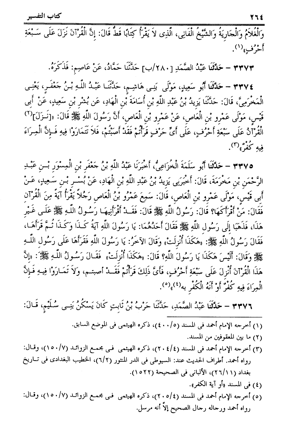 3374 - حَدَّثَنَا أَبُو سَعِيدٍ، مَوْلَى بَنِى هَاشِمٍ، حَدَّثَنَا عَبْدُ اللَّهِ بْنُ جَعْفَرٍ، يَعْنِى الْمَخْرَمِىَّ، قَالَ: حَدَّثَنَا يَزِيدُ بْنُ عَبْدِ اللَّهِ بْنِ أُسَامَةَ بْنِ الْهَادِ، عَن بُشْرِ بْنِ سَعِيدٍ، عَنْ أَبِى قَيْسٍ، مَوْلَى عَمْرِو بْنِ الْعَاصِ، عَنْ عَمْرِو بْنِ الْعَاصِ، أَنَّ رَسُولَ اللَّهِ صلى الله عليه وسلم قَالَ: [نَزَلَ] الْقُرْآنُ عَلَى سَبْعَةِ أَحْرُفٍ، عَلَى أَىِّ حَرْفٍ قَرَأْتُمْ فَقَدْ أَصَبْتُمْ، فَلاَ تَتَمَارَوْا فِيهِ فَإِنَّ الْمِرَاءَ فِيهِ كُفْرٌ.