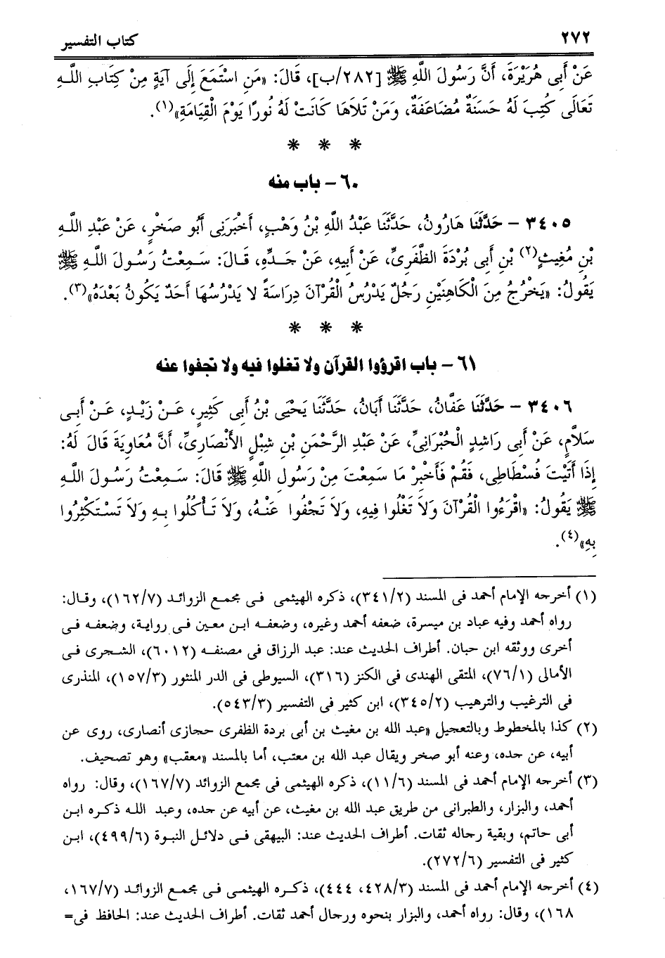 3406 - حَدَّثَنَا عَفَّانُ، حَدَّثَنَا أَبَانُ، حَدَّثَنَا يَحْيَى بْنُ أَبِى كَثِيرٍ، عَنْ زَيْدٍ، عَنْ أَبِى سَلاَّمٍ، عَنْ أَبِى رَاشِدٍ الْحُبْرَانِىِّ، عَنْ عَبْدِ الرَّحْمَنِ بْنِ شِبْلٍ الأَنْصَارِىِّ، أَنَّ مُعَاوِيَةَ قَالَ لَهُ: إِذَا أَتَيْتَ فُسْطَاطِى، فَقُمْ فَأَخْبِرْ مَا سَمِعْتَ مِنْ رَسُولِ اللَّهِ صلى الله عليه وسلم قَالَ: سَمِعْتُ رَسُولَ اللَّهِ صلى الله عليه وسلم يَقُولُ: اقْرَءُوا الْقُرْآنَ وَلاَ تَغْلُوا فِيهِ، وَلاَ تَجْفُوا عَنْهُ، وَلاَ تَأْكُلُوا بِهِ وَلاَ تَسْتَكْثِرُوا بِهِ. -[273]-