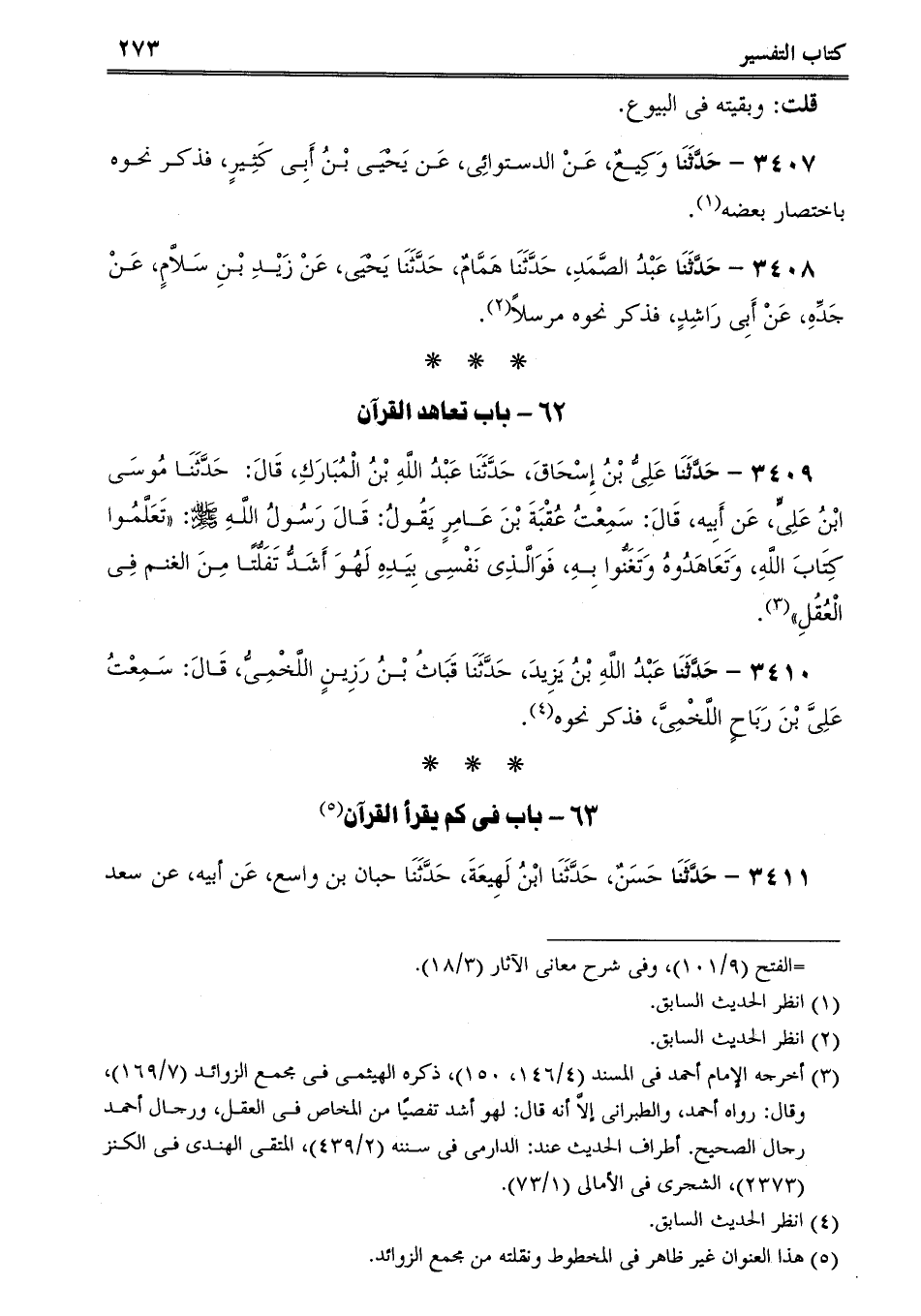 3409 - حَدَّثَنَا عَلِىُّ بْنُ إِسْحَاقَ، حَدَّثَنَا عَبْدُ اللَّهِ بْنُ الْمُبَارَكِ، قَالَ: حَدَّثَنَا مُوسَى ابْنُ عَلِىٍّ، عَن أَبِيه، قَالَ: سَمِعْتُ عُقْبَةَ بْنَ عَامِرٍ يَقُولُ: قَالَ رَسُولُ اللَّهِ صلى الله عليه وسلم: تَعَلَّمُوا كِتَابَ اللَّهِ، وَتَعَاهَدُوهُ وَتَغَنُّوا بِهِ، فَوَالَّذِى نَفْسِى بِيَدِهِ لَهُوَ أَشَدُّ تَفَلُّتًا مِنَ الغنم فِى الْعُقُلِ.