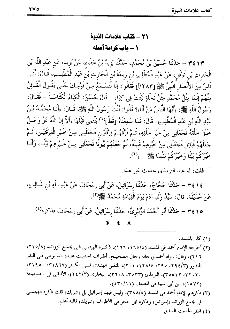 3413 - حَدَّثَنَا حُسَيْنُ بْنُ مُحَمَّدٍ، حَدَّثَنَا يَزِيدُ بْنُ عَطَاءٍ، عَنْ يَزِيدَ، عَنِ عَبْدِ اللَّهِ بْنِ الْحَارِثِ بْنِ نَوْفَلٍ، عَنْ عَبْدِ الْمُطَّلِبِ بْنِ رَبِيعَةَ بْنِ الْحَارِثِ بْنِ عَبْدِ الْمُطَّلِبِ، قَالَ: أَتَى نَاسٌ مِنَ الأَنْصَارِ النَّبِىَّ صلى الله عليه وسلم فَقَالُوا: إِنَّا لَنَسْمَعُ مِنْ قَوْمِكَ حَتَّى يَقُولَ الْقَائِلُ مِنْهُمْ إِنَّمَا مِثْلُ مُحَمَّدٍ مِثْلُ نَخْلَةٍ نَبَتَتْ فِى كِبَاءٍ قَالَ حُسَيْنٌ: الْكِبَاءُ الْكُنَاسَةُ فَقَالَ: رَسُولُ اللَّهِ صلى الله عليه وسلم: أَيُّهَا النَّاسُ مَنْ أَنَا؟ قَالُوا: أَنْتَ رَسُولُ اللَّهِ صلى الله عليه وسلم، قَالَ: أَنَا مُحَمَّدُ بْنُ عَبْدِ اللَّهِ بْنِ عَبْدِ الْمُطَّلِبِ. قَالَ: فَمَا سَمِعْنَاهُ [قَطُّ] يَنْتَمِى قَبْلَهَا أَلاَّ إِنَّ اللَّهَ عَزَّ وَجَلَّ خَلَقَ خَلْقَهُ فَجَعَلَنِى مِنْ خَيْرِ خَلْقِهِ، ثُمَّ فَرَّقَهُمْ فِرْقَتَيْنِ فَجَعَلَنِى مِنْ خَيْرِ الْفِرْقَتَيْنِ، ثُمَّ جَعَلَهُمْ قَبَائِلَ فَجَعَلَنِى مِنْ خَيْرِهِمْ قَبِيلَةً، ثُمَّ جَعَلَهُمْ بُيُوتًا فَجَعَلَنِى مِنْ خَيْرِهِمْ بَيْتًا، وَأَنَا خَيْرُكُمْ بَيْتًا وَخَيْرُكُمْ نَفْسًا صلى الله عليه وسلم.