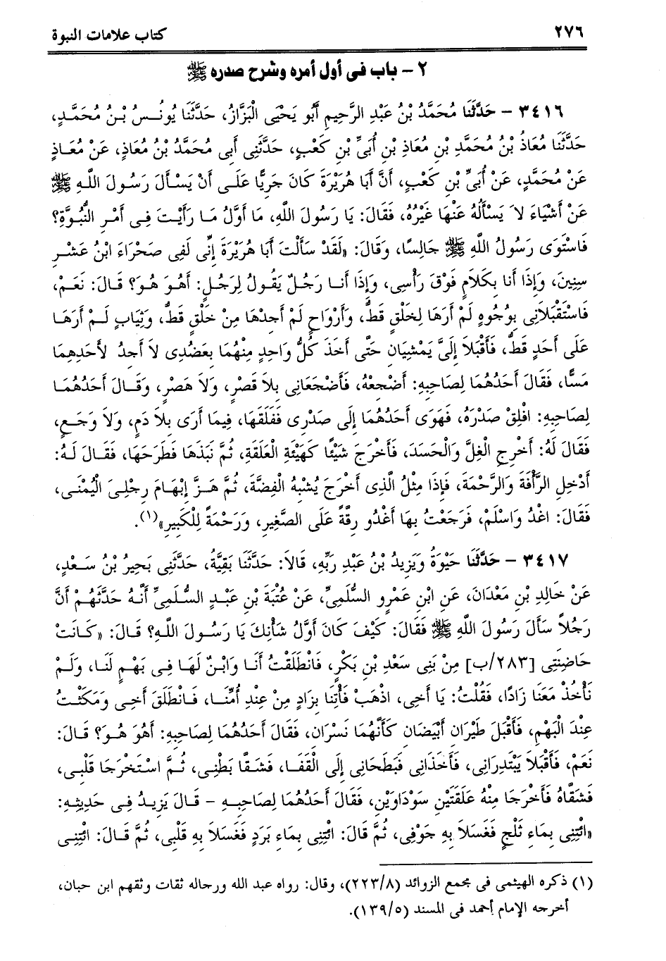 3417 - حَدَّثَنَا حَيْوَةُ وَيَزِيدُ بْنُ عَبْدِ رَبِّهِ، قَالاَ: حَدَّثَنَا بَقِيَّةُ، حَدَّثَنِى بَحِيرُ بْنُ سَعْدٍ، عَنْ خَالِدِ بْنِ مَعْدَانَ، عَنِ ابْنِ عَمْرٍو السُّلَمِىِّ، عَنْ عُتْبَةَ بْنِ عَبْدٍ السُّلَمِىِّ أَنَّهُ حَدَّثَهُمْ أَنَّ رَجُلاً سَأَلَ رَسُولَ اللَّهِ صلى الله عليه وسلم فَقَالَ: كَيْفَ كَانَ أَوَّلُ شَأْنِكَ يَا رَسُولَ اللَّهِ؟ قَالَ: كَانَتْ حَاضِنَتِى مِنْ بَنِى سَعْدِ بْنِ بَكْرٍ، فَانْطَلَقْتُ أَنَا وَابْنٌ لَهَا فِى بَهْمٍ لَنَا، وَلَمْ نَأْخُذْ مَعَنَا زَادًا، فَقُلْتُ: يَا أَخِى، اذْهَبْ فَأْتِنَا بِزَادٍ مِنْ عِنْدِ أُمِّنَا، فَانْطَلَقَ أَخِى وَمَكَثْتُ عِنْدَ الْبَهْمِ، فَأَقْبَلَ طَيْرَانِ أَبْيَضَانِ كَأَنَّهُمَا نَسْرَانِ، فَقَالَ أَحَدُهُمَا لِصَاحِبِهِ: أَهُوَ هُوَ؟ قَالَ: نَعَمْ، فَأَقْبَلاَ يَبْتَدِرَانِى، فَأَخَذَانِى فَبَطَحَانِى إِلَى الْقَفَا، فَشَقَّا بَطْنِى، ثُمَّ اسْتَخْرَجَا قَلْبِى، فَشَقَّاهُ فَأَخْرَجَا مِنْهُ عَلَقَتَيْنِ سَوْدَاوَيْنِ، فَقَالَ أَحَدُهُمَا لِصَاحِبِهِ قَالَ يَزِيدُ فِى حَدِيثِهِ: ائْتِنِى بِمَاءِ ثَلْجٍ فَغَسَلاَ بِهِ جَوْفِى، ثُمَّ قَالَ: ائْتِنِى بِمَاءِ بَرَدٍ فَغَسَلاَ بِهِ قَلْبِى، ثُمَّ قَالَ: ائْتِنِى -[277]- بِالسَّكِينَةِ فَذَرَّاهَا فِى قَلْبِى، ثُمَّ قَالَ أَحَدُهُمَا لِصَاحِبِهِ: حِصْهُ فَحَاصَهُ، وَخَتَمَ عَلَيْهِ بِخَاتَمِ النُّبُوَّةِ.