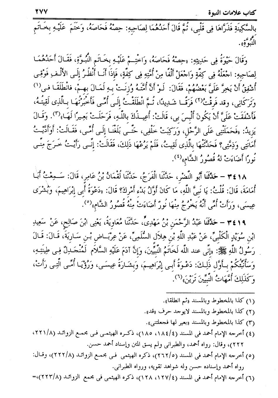 3419 - حَدَّثَنَا عَبْدُ الرَّحْمَنِ بْنُ مَهْدِىٍّ، حَدَّثَنَا مُعَاوِيَةُ، يَعْنِى ابْنَ صَالِحٍ، عَنْ سَعِيدِ ابْنِ سُوَيْدٍ الْكَلْبِىِّ، عَنْ عَبْدِ اللَّهِ بْنِ هِلاَلٍ السُّلَمِىِّ، عَنْ عِرْبَاضِ بْنِ سَارِيَةَ، قَالَ: قَالَ رَسُولُ اللَّهِ صلى الله عليه وسلم: إِنِّى عند اللَّه لَخَاتَمُ النَّبِيِّينَ، وَإِنَّ آدَمَ عَلَيْهِ السَّلاَم لَمُنْجَدِلٌ فِى طِينَتِهِ، وَسَأُنَبِّئُكُمْ بِأَوَّلِ ذَلِكَ: دَعْوَةُ أَبِى إِبْرَاهِيمَ، وَبِشَارَةُ عِيسَى، وَرُؤْيَا أُمِّى الَّتِى رَأَتْ، وَكَذَلِكَ أُمَّهَاتُ النَّبِيِّينَ تَرَيْنَ.