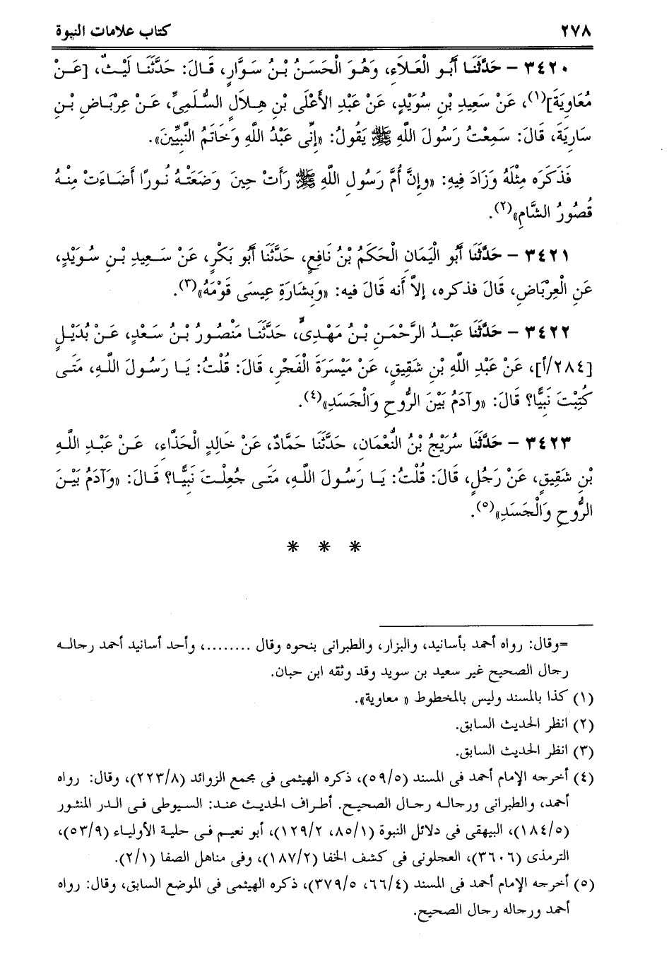 3420 - حَدَّثَنَا أَبُو الْعَلاَءِ، وَهُوَ الْحَسَنُ بْنُ سَوَّارٍ، قَالَ: حَدَّثَنَا لَيْثٌ، [عَنْ مُعَاوِيَةَ] ، عَنْ سَعِيدِ بْنِ سُوَيْدٍ، عَنْ عَبْدِ الأَعْلَى بْنِ هِلاَلٍ السُّلَمِىِّ، عَنْ عِرْبَاضِ بْنِ سَارِيَةَ، قَالَ: سَمِعْتُ رَسُولَ اللَّهِ صلى الله عليه وسلم يَقُولُ: إِنِّى عَبْدُ اللَّهِ وَخَاتَمُ النَّبِيِّينَ.