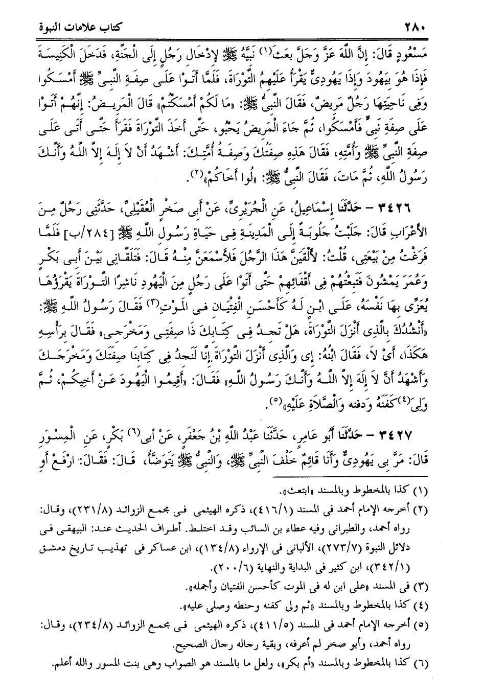 3426 - حَدَّثَنَا إِسْمَاعِيلُ، عَنِ الْجُرَيْرِىِّ، عَنْ أَبِى صَخْرٍ الْعُقَيْلِىِّ، حَدَّثَنِى رَجُلٌ مِنَ الأَعْرَابِ قَالَ: جَلَبْتُ جَلُوبَةً إِلَى الْمَدِينَةِ فِى حَيَاةِ رَسُولِ اللَّهِ صلى الله عليه وسلم فَلَمَّا فَرَغْتُ مِنْ بَيْعَتِى، قُلْتُ: لأَلْقَيَنَّ هَذَا الرَّجُلَ فَلأَسْمَعَنَّ مِنْهُ قَالَ: فَتَلَقَّانِى بَيْنَ أَبِى بَكْرٍ وَعُمَرَ يَمْشُونَ فَتَبِعْتُهُمْ فِى أَقْفَائِهِمْ حَتَّى أَتَوْا عَلَى رَجُلٍ مِنَ الْيَهُودِ نَاشِرًا التَّوْرَاةَ يَقْرَؤُهَا يُعَزِّى بِهَا نَفْسَهُ، عَلَى ابْنٍ لَهُ كَأَحْسَنِ الْفِتْيَانِ فى المَوْتِ فَقَالَ رَسُولُ اللَّهِ صلى الله عليه وسلم: أَنْشُدُكَ بِالَّذِى أَنْزَلَ التَّوْرَاةَ، هَلْ تَجِدُ فِى كِتَابِكَ ذَا صِفَتِى وَمَخْرَجِى فَقَالَ بِرَأْسِهِ هَكَذَا، أَىْ لاَ، فَقَالَ ابْنُهُ: إِى وَالَّذِى أَنْزَلَ التَّوْرَاةَ إِنَّا لَنَجِدُ فِى كِتَابِنَا صِفَتَكَ وَمَخْرَجَكَ وَأَشْهَدُ أَنَّ لاَ إِلَهَ إِلاَّ اللَّهُ وَأَنَّكَ رَسُولُ اللَّهِ فَقَالَ: أَقِيمُوا الْيَهُودَ عَنْ أَخِيكُمْ، ثُمَّ وَلِىَكَفَنَهُ وَدفنه وَالْصَّلاَةِ عَلَيْهِ.
