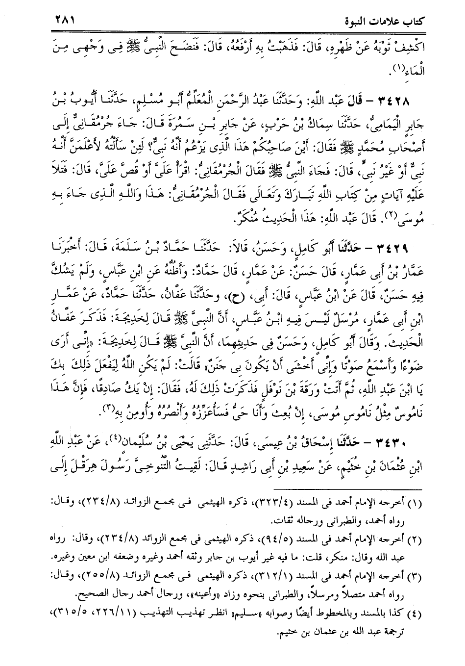 3429 - حَدَّثَنَا أَبُو كَامِلٍ، وَحَسَنُ، قَالاَ: حَدَّثَنَا حَمَّادٌ بْنُ سَلَمَةَ، قَالَ: أَخْبَرَنَا عَمَّارُ بْنُ أَبِى عَمَّارٍ، قَالَ حَسَنٌ: عَنْ عَمَّارٍ، قَالَ حَمَّادٌ: وَأَظُنُّهُ عَنِ ابْنِ عَبَّاسٍ، وَلَمْ يَشُكَّ فِيهِ حَسَنٌ، قَالَ عَنْ ابْنُ عَبَّاسٍ، قَالَ: أَبِى، (ح) ، وحَدَّثَنَا عَفَّانُ، حَدَّثَنَا حَمَّادٌ، عَنْ عَمَّارِ ابْنِ أَبِى عَمَّارٍ، مُرْسَلٌ لَيْسَ فِيهِ ابْنُ عَبَّاسٍ، أَنَّ النَّبِىَّ صلى الله عليه وسلم قَالَ لِخَدِيجَةَ: فَذَكَرَ عَفَّانُ الْحَدِيثَ. وَقَالَ أَبُو كَامِلٍ، وَحَسَنٌ فِى حَدِيثِهِمَا، أَنَّ النَّبِىَّ صلى الله عليه وسلم قَالَ لِخَدِيجَةَ: إِنِّى أَرَى ضَوْءًا وَأَسْمَعُ صَوْتًا وَإِنِّى أَخْشَى أَنْ يَكُونَ بِى جَنَنٌ قَالَتْ: لَمْ يَكُنِ اللَّهُ لِيَفْعَلَ ذَلِكَ بِكَ يَا ابْنَ عَبْدِ اللَّهِ، ثُمَّ أَتَتْ وَرَقَةَ بْنَ نَوْفَلٍ فَذَكَرَتْ ذَلِكَ لَهُ، فَقَالَ: إِنْ يَكُ صَادِقًا، فَإِنَّ هَذَا نَامُوسٌ مِثْلُ نَامُوسِ مُوسَى، إِنْ بُعِثَ وَأَنَا حَىُّ فَسَأُعَزِّزُهُ وَأَنْصُرُهُ وَأُومِنُ بِهِ.