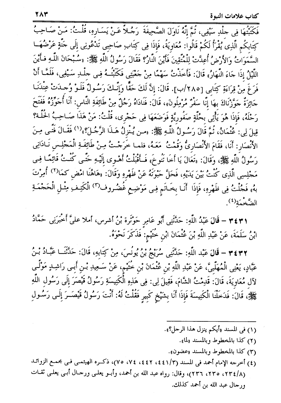 3432 - قَالَ عَبْد اللَّهِ: حَدَّثَنِى سُرَيْجُ بْنُ يُونُسَ، مِنْ كِتَابِهِ، قَالَ: حَدَّثَنَا عَبَّادُ بْنُ عَبَّادٍ، يَعْنِى الْمُهَلَّبِىَّ، عَنْ عَبْدِ اللَّهِ بْنِ عُثْمَانَ بْنِ خُثَيْمٍ، عَنْ سَعِيدِ بْنِ أَبِى رَاشِدٍ مَوْلًى لآلِ مُعَاوِيَةَ، قَالَ: قَدِمْتُ الشَّامَ، فَقِيلَ لِى: فِى هَذِهِ الْكَنِيسَةِ رَسُولُ قَيْصَرَ إِلَى رَسُولِ اللَّهِ صلى الله عليه وسلم، قَالَ: فَدَخَلْنَا الْكَنِيسَةَ فَإِذَا أَنَا بِشَيْخٍ كَبِيرٍ فَقُلْتُ لَهُ: أَنْتَ رَسُولُ قَيْصَرَ إِلَى رَسُولِ -[284]- اللَّهِ صلى الله عليه وسلم؟، فَقَالَ: نَعَمْ، فَذَكَرَ نَحْوَهُ بمعناه.