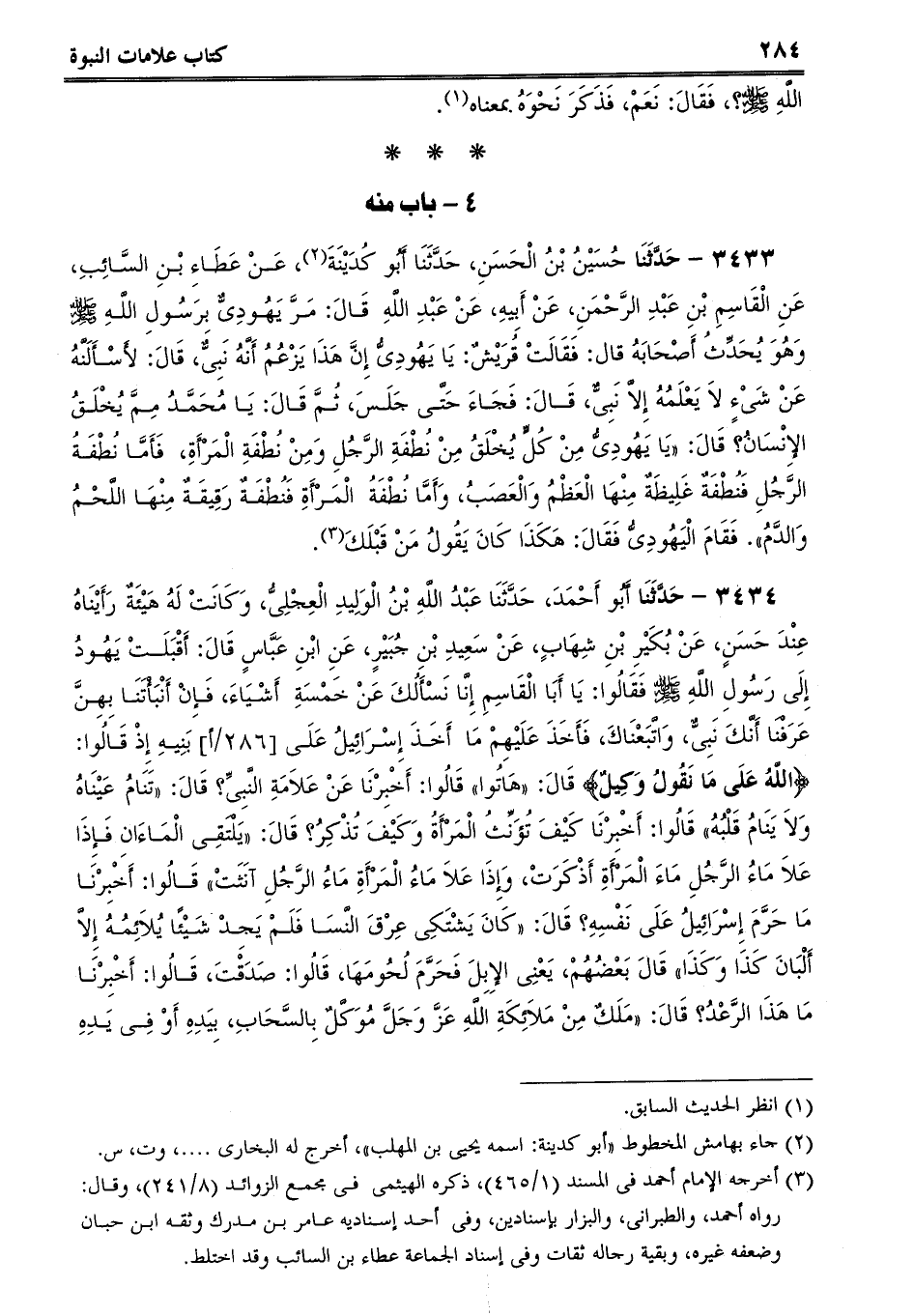 3433 - حَدَّثَنَا حُسَيْنُ بْنُ الْحَسَنِ، حَدَّثَنَا أَبُو كُدَيْنَةَ، عَنْ عَطَاءِ بْنِ السَّائِبِ، عَنِ الْقَاسِمِ بْنِ عَبْدِ الرَّحْمَنِ، عَنْ أَبِيهِ، عَنْ عَبْدِ اللَّهِ قَالَ: مَرَّ يَهُودِىٌّ بِرَسُولِ اللَّهِ صلى الله عليه وسلم وَهُوَ يُحَدِّثُ أَصْحَابَهُ قال: فَقَالَتْ قُرَيْشٌ: يَا يَهُودِىُّ إِنَّ هَذَا يَزْعُمُ أَنَّهُ نَبِىٌّ، قَالَ: لأَسْأَلَنَّهُ عَنْ شَىْءٍ لاَ يَعْلَمُهُ إِلاَّ نَبِىٌّ، قَالَ: فَجَاءَ حَتَّى جَلَسَ، ثُمَّ قَالَ: يَا مُحَمَّدُ مِمَّ يُخْلَقُ الإِنْسَانُ؟ قَالَ: يَا يَهُودِىُّ مِنْ كُلٍّ يُخْلَقُ مِنْ نُطْفَةِ الرَّجُلِ وَمِنْ نُطْفَةِ الْمَرْأَةِ، فَأَمَّا نُطْفَةُ الرَّجُلِ فَنُطْفَةٌ غَلِيظَةٌ مِنْهَا الْعَظْمُ وَالْعَصَبُ، وَأَمَّا نُطْفَةُ الْمَرْأَةِ فَنُطْفَةٌ رَقِيقَةٌ مِنْهَا اللَّحْمُ وَالدَّمُ. فَقَامَ الْيَهُودِىُّ فَقَالَ: هَكَذَا كَانَ يَقُولُ مَنْ قَبْلَكَ.