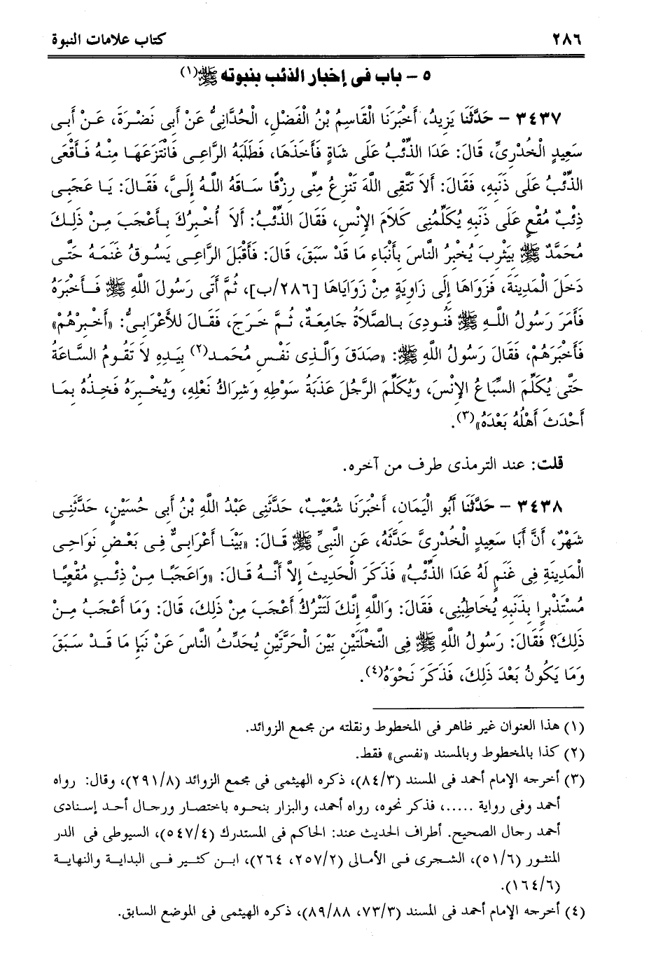 3437 - حَدَّثَنَا يَزِيدُ، أَخْبَرَنَا الْقَاسِمُ بْنُ الْفَضْلِ، الْحُدَّانِىُّ عَنْ أَبِى نَضْرَةَ، عَنْ أَبِى سَعِيدٍ الْخُدْرِىِّ، قَالَ: عَدَا الذِّئْبُ عَلَى شَاةٍ فَأَخَذَهَا، فَطَلَبَهُ الرَّاعِى فَانْتَزَعَهَا مِنْهُ فَأَقْعَى الذِّئْبُ عَلَى ذَنَبِهِ، فَقَالَ: أَلاَ تَتَّقِى اللَّهَ تَنْزِعُ مِنِّى رِزْقًا سَاقَهُ اللَّهُ إِلَىَّ، فَقَالَ: يَا عَجَبِى ذِئْبٌ مُقْعٍ عَلَى ذَنَبِهِ يُكَلِّمُنِى كَلاَمَ الإِنْسِ، فَقَالَ الذِّئْبُ: أَلاَ أُخْبِرُكَ بِأَعْجَبَ مِنْ ذَلِكَ مُحَمَّدٌ صلى الله عليه وسلم بِيَثْرِبَ يُخْبِرُ النَّاسَ بِأَنْبَاءِ مَا قَدْ سَبَقَ، قَالَ: فَأَقْبَلَ الرَّاعِى يَسُوقُ غَنَمَهُ حَتَّى دَخَلَ الْمَدِينَةَ، فَزَوَاهَا إِلَى زَاوِيَةٍ مِنْ زَوَايَاهَا، ثُمَّ أَتَى رَسُولَ اللَّهِ صلى الله عليه وسلم فَأَخْبَرَهُ فَأَمَرَ رَسُولُ اللَّهِ صلى الله عليه وسلم فَنُودِىَ بالصَّلاَةُ جَامِعَةٌ، ثُمَّ خَرَجَ، فَقَالَ للأَعْرَابِىُّ: أَخْبِرْهُمْ فَأَخْبَرَهُمْ، فَقَالَ رَسُولُ اللَّهِ صلى الله عليه وسلم: صَدَقَ وَالَّذِى نَفْسِ مُحَمد بِيَدِهِ لاَ تَقُومُ السَّاعَةُ حَتَّى يُكَلِّمَ السِّبَاعُ الإِنْسَ، وَيُكَلِّمَ الرَّجُلَ عَذَبَةُ سَوْطِهِ وَشِرَاكُ نَعْلِهِ، وَيُخْبِرَهُ فَخِذُهُ بِمَا أَحْدَثَ أَهْلُهُ بَعْدَهُ.