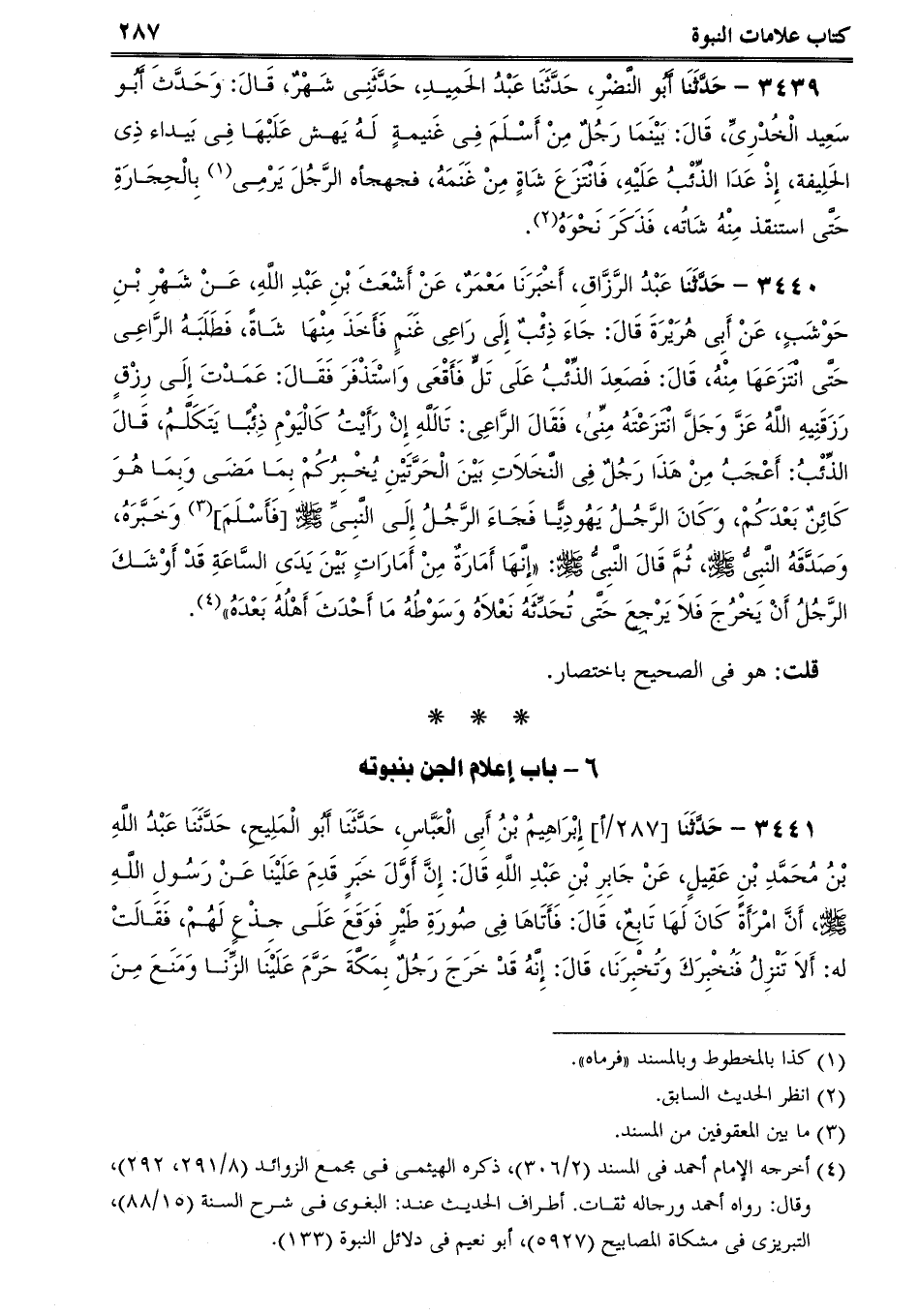 3440 - حَدَّثَنَا عَبْدُ الرَّزَّاقِ، أَخْبَرَنَا مَعْمَرٌ، عَنْ أَشْعَثَ بْنِ عَبْدِ اللَّهِ، عَنْ شَهْرِ بْنِ حَوْشَبٍ، عَنْ أَبِى هُرَيْرَةَ قَالَ: جَاءَ ذِئْبٌ إِلَى رَاعِى غَنَمٍ فَأَخَذَ مِنْهَا شَاةً، فَطَلَبَهُ الرَّاعِى حَتَّى انْتَزَعَهَا مِنْهُ، قَالَ: فَصَعِدَ الذِّئْبُ عَلَى تَلٍّ فَأَقْعَى وَاسْتَذْفَرَ فَقَالَ: عَمَدْتَ إِلَى رِزْقٍ رَزَقَنِيهِ اللَّهُ عَزَّ وَجَلَّ انْتَزَعْتَهُ مِنِّى، فَقَالَ الرَّاعِى: تَالَلَّهِ إِنْ رَأَيْتُ كَالْيَوْمِ ذِئْبًا يَتَكَلَّمُ، قَالَ الذِّئْبُ: أَعْجَبُ مِنْ هَذَا رَجُلٌ فِى النَّخَلاَتِ بَيْنَ الْحَرَّتَيْنِ يُخْبِرُكُمْ بِمَا مَضَى وَبِمَا هُوَ كَائِنٌ بَعْدَكُمْ، وَكَانَ الرَّجُلُ يَهُودِيًّا فَجَاءَ الرَّجُلُ إِلَى النَّبِىِّ صلى الله عليه وسلم [فَأَسْلَمَ] وَخَبَّرَهُ، وَصَدَّقَهُ النَّبِىُّ صلى الله عليه وسلم، ثُمَّ قَالَ النَّبِىُّ صلى الله عليه وسلم: إِنَّهَا أَمَارَةٌ مِنْ أَمَارَاتٍ بَيْنَ يَدَىِ السَّاعَةِ قَدْ أَوْشَكَ الرَّجُلُ أَنْ يَخْرُجَ فَلاَ يَرْجِعَ حَتَّى تُحَدِّثَهُ نَعْلاَهُ وَسَوْطُهُ مَا أَحْدَثَ أَهْلُهُ بَعْدَهُ.