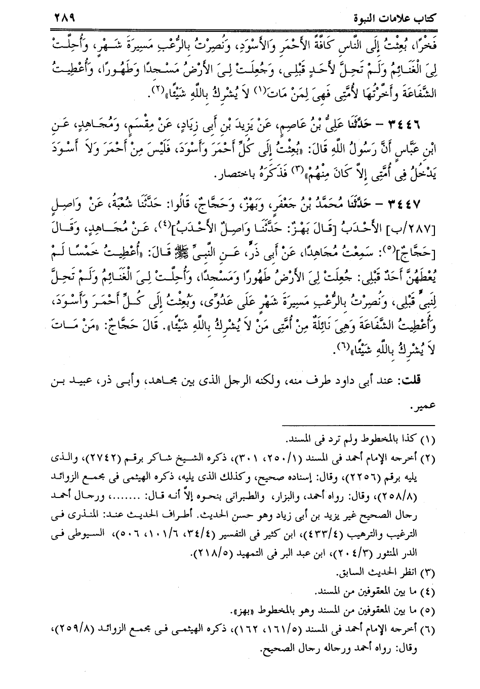 3447 - حَدَّثَنَا مُحَمَّدُ بْنُ جَعْفَرٍ، وَبَهْزٌ، وَحَجَّاجٌ، قَالُوا: حَدَّثَنَا شُعْبَةُ، عَنْ وَاصِلٍ الأَحْدَبُ [قَالَ بَهْزٌ: حَدَّثَنَا وَاصِلٌ الأَحْدَبُ] ، عَنْ مُجَاهِدٍ، وَقَالَ [حَجَّاجٌ] : سَمِعْتُ مُجَاهِدًا، عَنْ أَبِى ذَرٍّ، عَنِ النَّبِىِّ صلى الله عليه وسلم قَالَ: أُعْطِيتُ خَمْسًا لَمْ يُعْطَهُنَّ أَحَدٌ قَبْلِى: جُعِلَتْ لِىَ الأَرْضُ طَهُورًا وَمَسْجِدًا، وَأُحِلَّتْ لِىَ الْغَنَائِمُ وَلَمْ تَحِلَّ لِنَبِىٍّ قَبْلِى، وَنُصِرْتُ بِالرُّعْبِ مَسِيرَةَ شَهْرٍ عَلَى عَدُوِّى، وَبُعِثْتُ إِلَى كُلِّ أَحْمَرَ وَأَسْوَدَ، وَأُعْطِيتُ الشَّفَاعَةَ وَهِىَ نَائِلَةٌ مِنْ أُمَّتِى مَنْ لاَ يُشْرِكُ بِاللَّهِ شَيْئًا. قَالَ حَجَّاجٌ: مَنْ مَاتَ لاَ يُشْرِكُ بِاللَّهِ شَيْئًا.