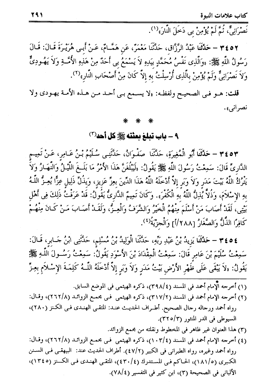 3454 - حَدَّثَنَا يَزِيدُ بْنُ عَبْدِ رَبِّهِ، حَدَّثَنَا الْوَلِيدُ بْنُ مُسْلِمٍ، حَدَّثَنِى ابْنُ جَابِرٍ، قَالَ: سَمِعْتُ سُلَيْمَ بْنَ عَامِرٍ قَالَ: سَمِعْتُ الْمِقْدَادَ بْنَ الأَسْوَدِ يَقُولُ: سَمِعْتُ رَسُولَ اللَّهِ صلى الله عليه وسلم يَقُولُ: لاَ يَبْقَى عَلَى ظَهْرِ الأَرْضِ بَيْتُ مَدَرٍ وَلاَ وَبَرٍ إِلاَّ أَدْخَلَهُ اللَّهُ كَلِمَةَ الإِسْلاَمِ بِعِزّ -[292]- ِ عَزِيزٍ أَوْ ذُلِّ ذَلِيلٍ، إِمَّا يُعِزُّهُمُ [اللَّهُ] عَزَّ وَجَلَّ فَيَجْعَلُهُمْ مِنْ أَهْلِهَا أَوْ يُذِلُّهُمْ فَيَدِينُونَ لَهَا.