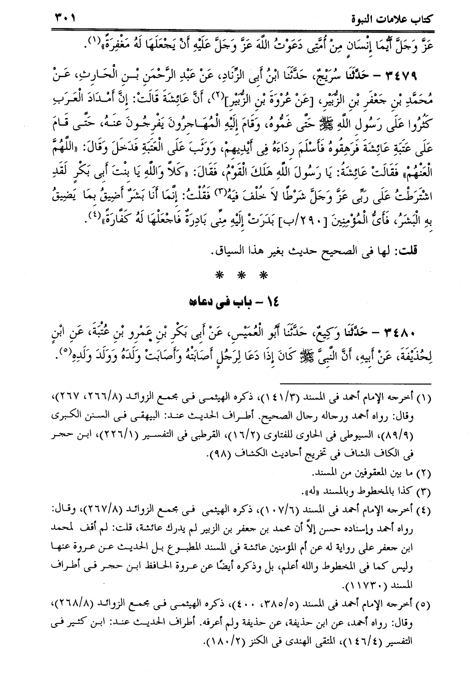 3479 - حَدَّثَنَا سُرَيْجٌ، حَدَّثَنَا ابْنُ أَبِى الزِّنَادِ، عَنْ عَبْدِ الرَّحْمَنِ بْنِ الْحَارِثِ، عَنْ مُحَمَّدِ بْنِ جَعْفَرِ بْنِ الزُّبَيْرِ، [عَنْ عُرْوَةَ بْنِ الزُّبَيْرِ] ، أَنَّ عَائِشَةَ قَالَتْ: إِنَّ أَمْدَادَ الْعَرَبِ كَثُرُوا عَلَى رَسُولِ اللَّهِ صلى الله عليه وسلم حَتَّى غَمُّوهُ، وَقَامَ إِلَيْهِ الْمُهَاجِرُونَ يَفْرِجُونَ عنَهُ، حَتَّى قَامَ عَلَى عَتَبَةِ عَائِشَةَ فَرَهِقُوهُ فَأَسْلَمَ رِدَاءَهُ فِى أَيْدِيهِمْ، وَوَثَبَ عَلَى الْعَتَبَةِ فَدَخَلَ وَقَالَ: اللَّهُمَّ الْعَنْهُمْ فَقَالَتْ عَائِشَةُ: يَا رَسُولَ اللَّهِ هَلَكَ الْقَوْمُ، فَقَالَ: كَلاَّ وَاللَّهِ يَا بِنْتَ أَبِى بَكْرٍ لَقَدِ اشْتَرَطْتُ عَلَى رَبِّى عَزَّ وَجَلَّ شَرْطًا لاَ خُلْفَ فيَهُ فَقُلْتُ: إِنَّمَا أَنَا بَشَرٌ أَضِيقُ بِمَا يَضِيقُ بِهِ الْبَشَرُ، فَأَىُّ الْمُؤْمِنِينَ بَدَرَتْ إِلَيْهِ مِنِّى بَادِرَةٌ فَاجْعَلْهَا لَهُ كَفَّارَةً.