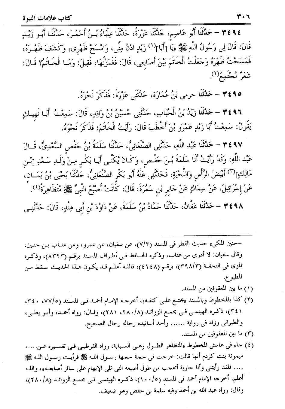 3497 - حَدَّثَنَا عَبْد اللَّهِ، حَدَّثَنِى الصَّنْعَانِىُّ، حَدَّثَنَا سَلَمَةُ بْنُ حَفْصٍ السَّعْدِىُّ، قَالَ عَبْد اللَّهِ: وَقَدْ رَأَيْتُ أَنَا سَلَمَةَ بْنَ حَفْصٍ، وَكَانَ يُكَنَّى أَبَا بَكْرٍ مِنْ وَلَدِ سَعْدِ [بْنِ مَالِكٍ] أَبْيَضَ الرَّأْسِ وَاللِّحْيَةِ، فَحَدَّثَنِى عَنْهُ أَبُو بَكْرٍ الصَّنْعَانِىُّ، حَدَّثَنَا يَحْيَى بْنُ يَمَانٍ، عَنْ إِسْرَائِيلَ، عَنْ سِمَاكٍ عَنْ جَابِرِ بْنِ سَمُرَةَ: قَالَ: كَانَتْ أُصْبُعُ النَّبِىِّ صلى الله عليه وسلم مُتَظَاهِرَةً.