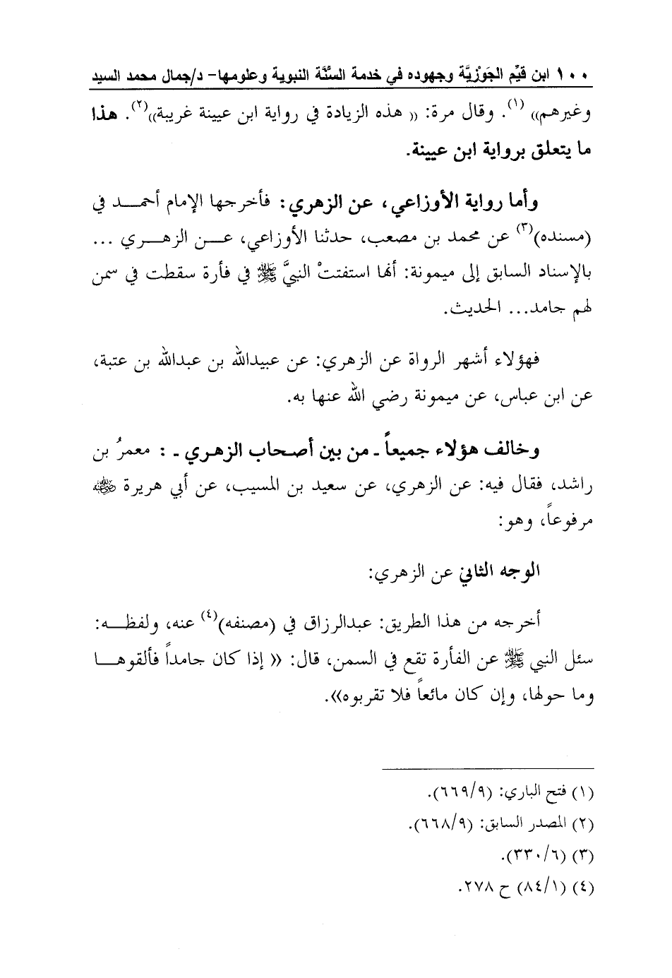 وأما رواية الأوزاعي، عن الزهري: فأخرجها الإمام أحمد في (مسنده) 3 عن محمد بن مصعب، حدثنا الأوزاعي، عن الزهري ... بالإسناد السابق إلى ميمونة: أنها استفتتْ النبيَّ صلى الله عليه وسلم في فأرة سقطت في سمن لهم جامد ... الحديث.