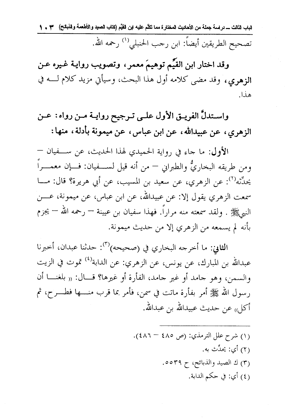 الأول: ما جاء في رواية الحميدي لهذا الحديث، عن سفيان - ومن طريقه البخاريُّ والطبراني - من أنه قيل لسفيان: فإن معمراً يحدِّثه2: عن الزهري، عن سعيد بن المسيب، عن أبي هريرة؟ قال: ما سمعت الزهري يقول إلا: عن عبيد الله، عن ابن عباس، عن ميمونة، عن النبي صلى الله عليه وسلم. ولقد سمعته منه مراراً. فهذا سفيان بن عيينة - رحمه الله - يجزم بأنه لم يسمعه من الزهري إلا من حديث ميمونة.