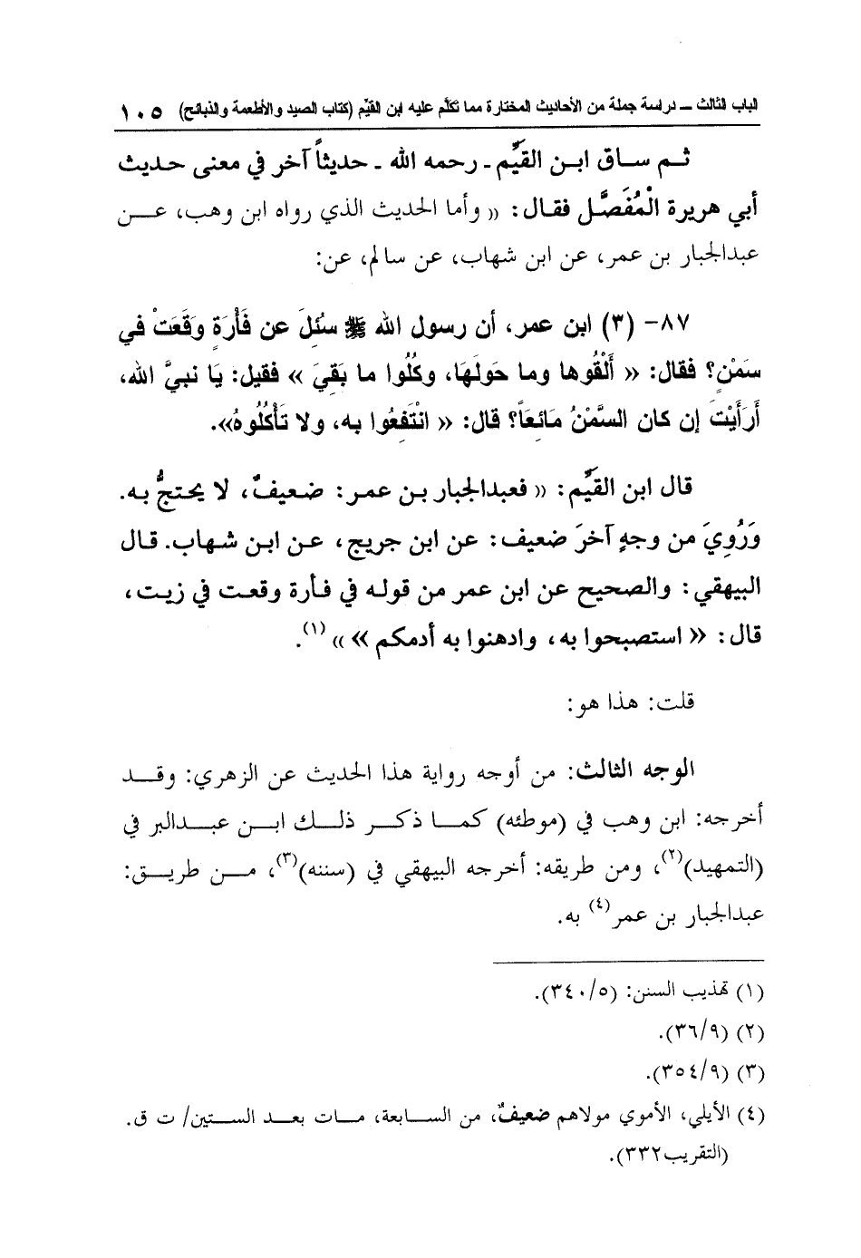 87- (3) ابن عمر، أن رسول الله صلى الله عليه وسلم سُئِلَ عن فَأْرَةٍ وَقَعَتْ في سَمْنٍ؟ فقال: "أَلْقُوها وما حَولَهَا، وكُلُوا ما بَقِيَ" فقيل: يَا نبيَّ الله، أَرَأَيْتَ إن كان السَّمْنُ مَائِعَاً؟ قال: "انْتَفِعُوا به، ولا تَأْكُلُوهُ".