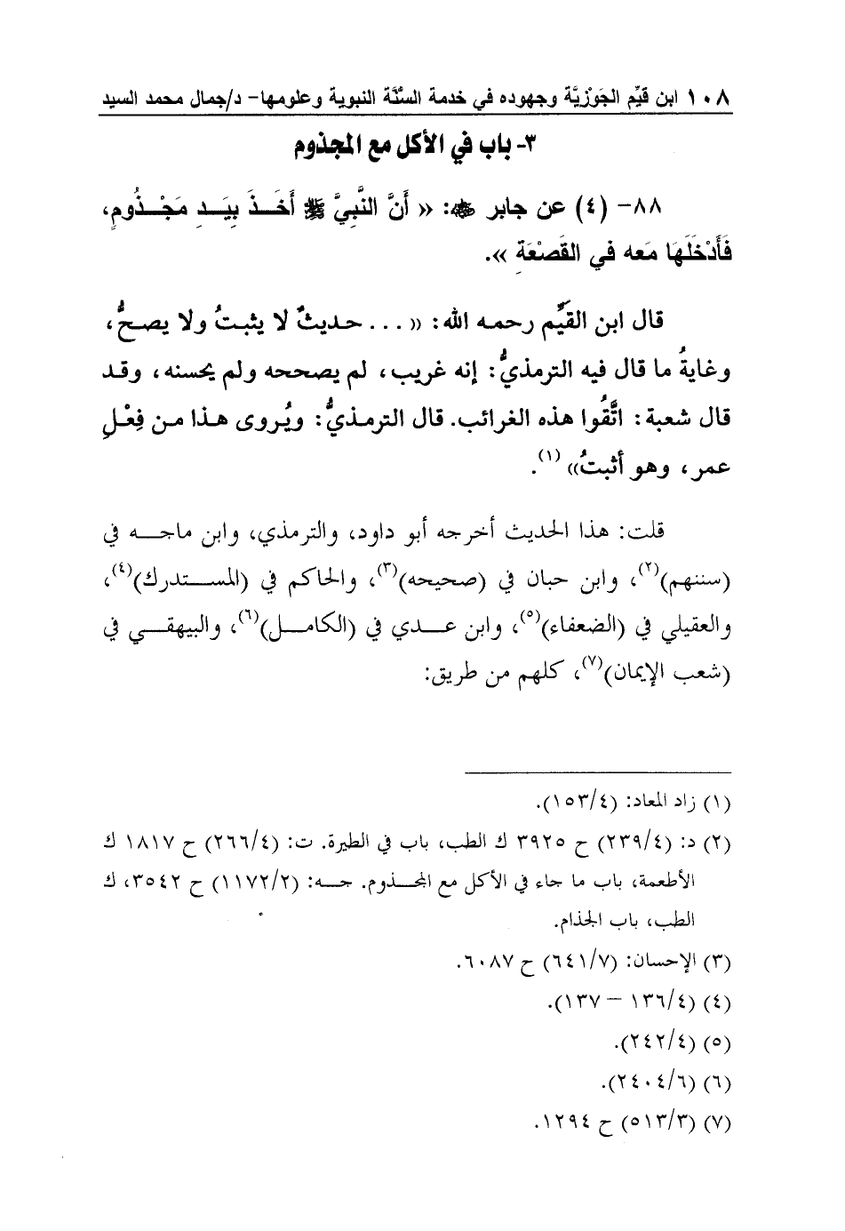 88- (4) عن جابر رضي الله عنه: "أَنَّ النَّبِيَّ صلى الله عليه وسلم أَخَذَ بِيَدِ مَجْذُومٍ، فَأَدْخَلَهَا مَعه في القَصْعَةِ".
