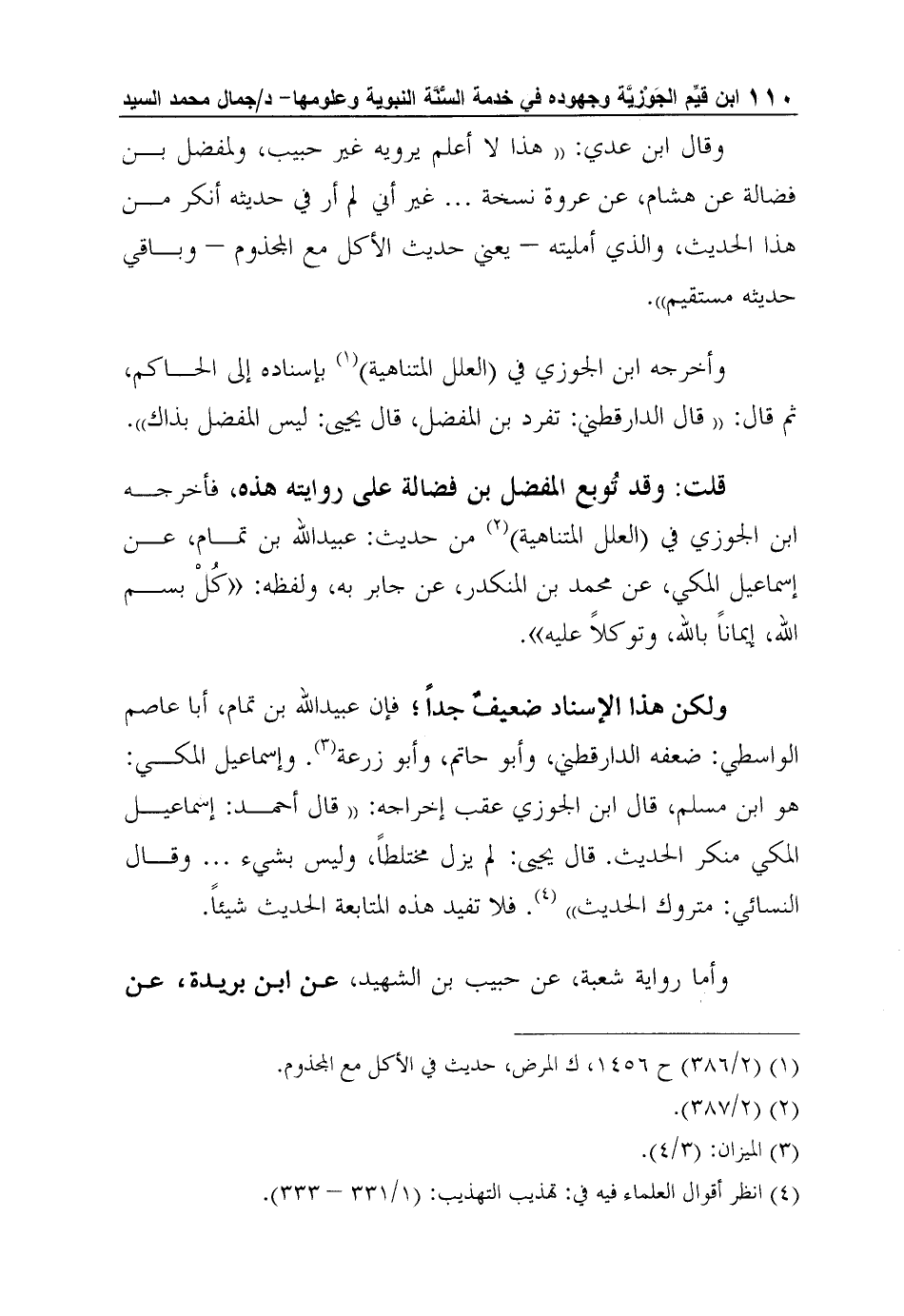 وقال ابن عدي: "هذا لا أعلم يرويه غير حبيب، ولمفضل بن فضالة عن هشام، عن عروة نسخة ... غير أني لم أر في حديثه أنكر من هذا الحديث، والذي أمليته - يعني حديث الأكل مع المجذوم - وباقي حديثه مستقيم".