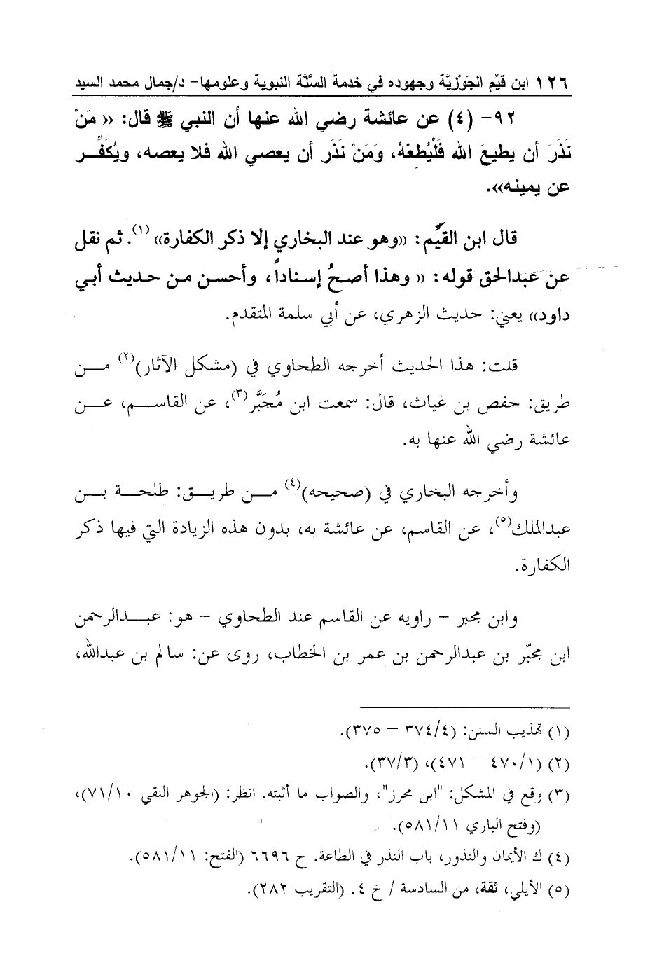 قلت: هذا الحديث أخرجه الطحاوي في (مشكل الآثار) 2 من طريق: حفص بن غياث، قال: سمعت ابن مُجَبَّر3، عن القاسم، عن عائشة رضي الله عنها به.