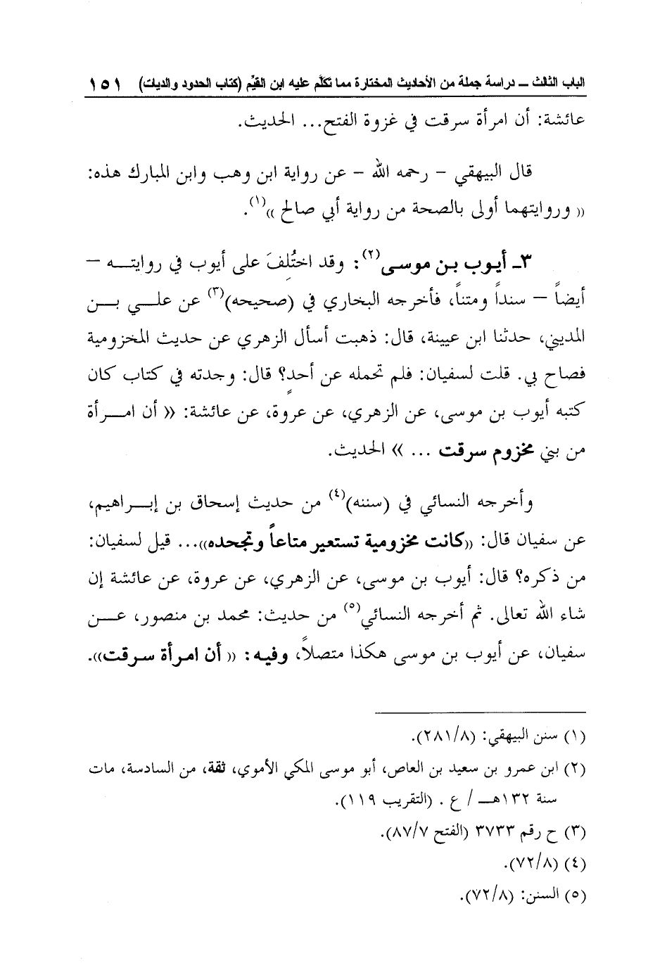 وأخرجه النسائي في (سننه) 4 من حديث إسحاق بن إبراهيم، عن سفيان قال: "كانت مخزومية تستعير متاعاً وتجحده" ... قيل لسفيان: من ذكره؟ قال: أيوب بن موسى، عن الزهري، عن عروة، عن عائشة إن شاء الله تعالى. ثم أخرجه النسائي5 من حديث: محمد بن منصور، عن سفيان، عن أيوب بن موسى هكذا متصلاً، وفيه: "أن امرأة سرقت".