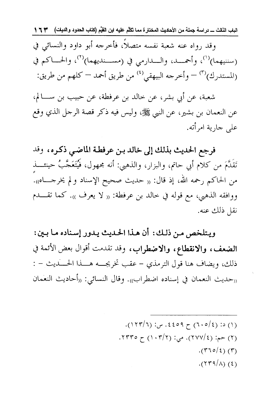 ويتلخص من ذلك: أن هذا الحديث يدور إسناده ما بين: الضعف، والانقطاع، والاضطراب، وقد تقدمت أقوال بعض الأئمة في ذلك، ويضاف هنا قول الترمذي - عقب تخريجه هذا الحديث -: "حديث النعمان في إسناده اضطراب". وقال النسائي: "أحاديث النعمان