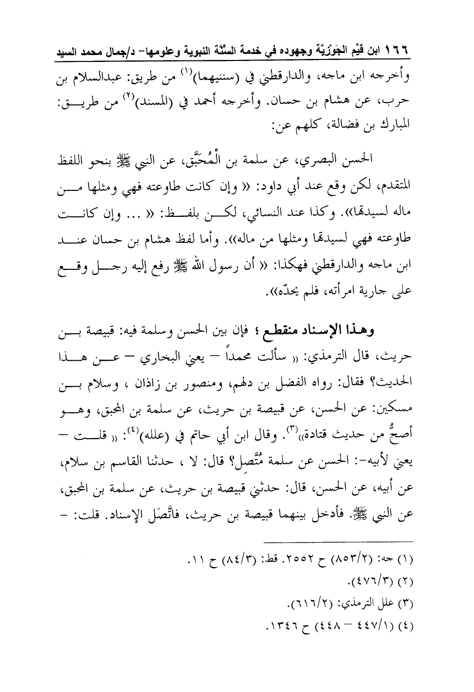 وهذا الإسناد منقطع؛ فإن بين الحسن وسلمة فيه: قبيصة بن حريث، قال الترمذي: "سألت محمداً - يعني البخاري - عن هذا الحديث؟ فقال: رواه الفضل بن دلهم، ومنصور بن زاذان، وسلام بن مسكين: عن الحسن، عن قبيصة بن حريث، عن سلمة بن المحبق، وهو أصحُّ من حديث قتادة"3. وقال ابن أبي حاتم في (علله) 4: "قلت - يعني لأبيه-: الحسن عن سلمة مُتَّصِل؟ قال: لا، حدثنا القاسم بن سلام، عن أبيه، عن الحسن، قال: حدثني قبيصة بن حريث، عن سلمة بن المحبق، عن النبي صلى الله عليه وسلم. فأدخل بينهما قبيصة بن حريث، فاتَّصَل الإسناد. قلت: -