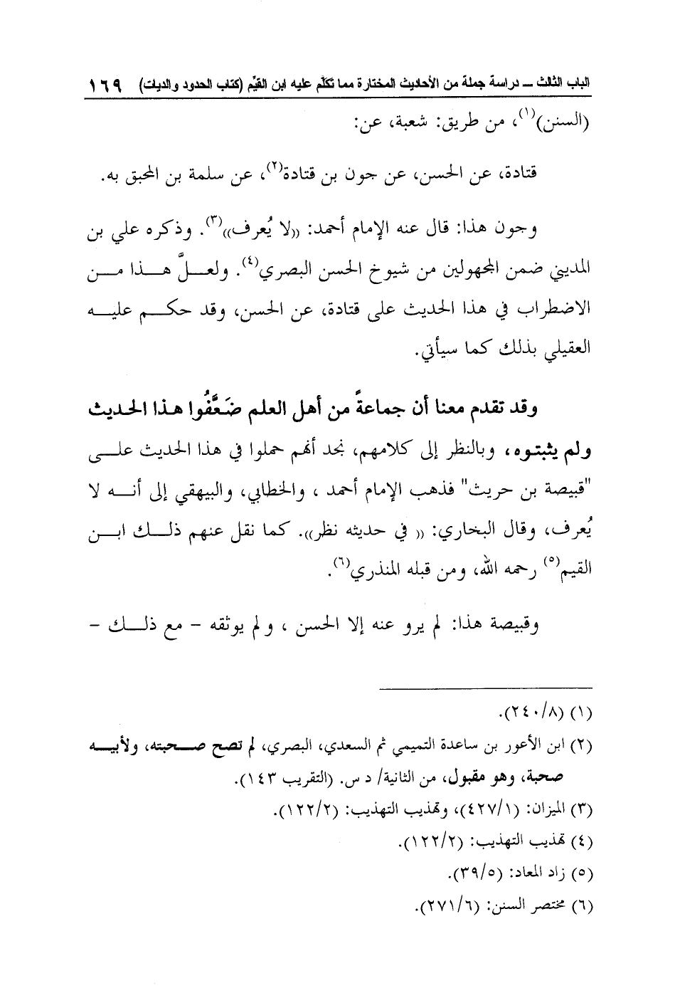 وقد تقدم معنا أن جماعةً من أهل العلم ضَعَّفُوا هذا الحديث ولم يثبتوه، وبالنظر إلى كلامهم، نجد أنهم حملوا في هذا الحديث على "قبيصة بن حريث" فذهب الإمام أحمد، والخطابي، والبيهقي إلى أنه لا يُعرف، وقال البخاري: "في حديثه نظر". كما نقل عنهم ذلك ابن القيم5 رحمه الله، ومن قبله المنذري6.