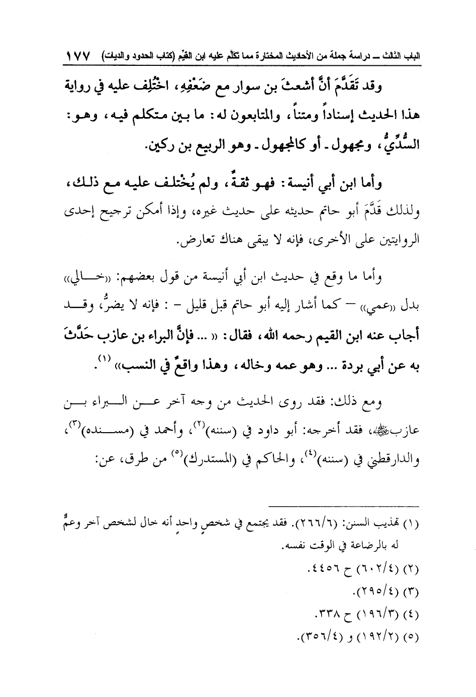 وأما ما وقع في حديث ابن أبي أنيسة من قول بعضهم: "خالي" بدل "عمي" - كما أشار إليه أبو حاتم قبل قليل -: فإنه لا يضرُّ، وقد أجاب عنه ابن القيم رحمه الله، فقال: " ... فإنَّ البراء بن عازب حَدَّثَ به عن أبي بردة ... وهو عمه وخاله، وهذا واقعٌ في النسب"1.