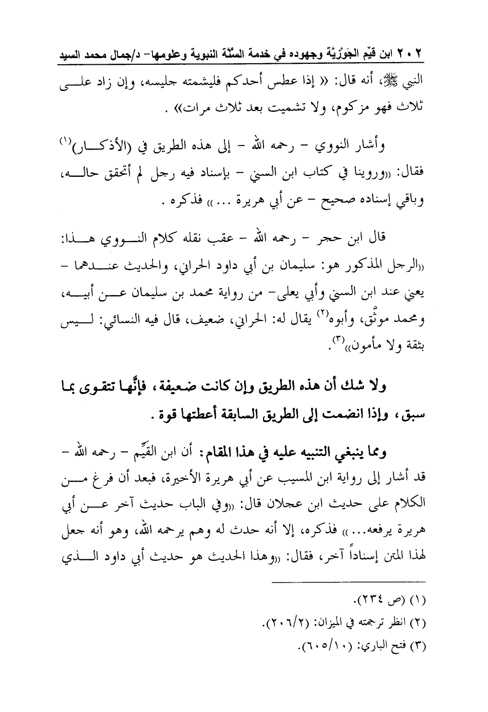 وأشار النووي - رحمه الله - إلى هذه الطريق في (الأذكار) 1 فقال: "وروينا في كتاب ابن السني - بإسناد فيه رجل لم أتحقق حاله، وباقي إسناده صحيح - عن أبي هريرة ... " فذكره.