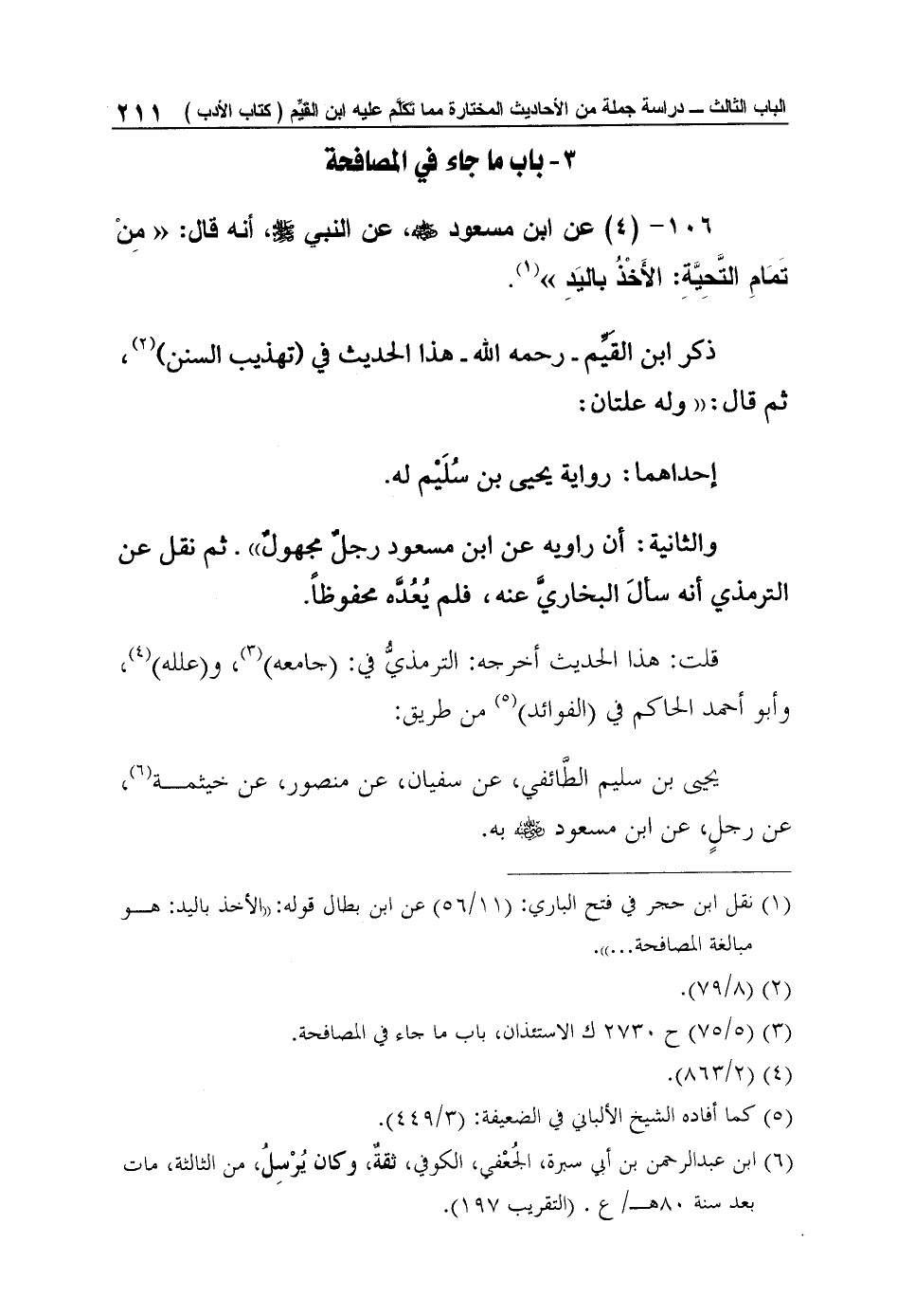 106- (4) عن ابن مسعود رضي الله عنه، عن النبي صلى الله عليه وسلم، أنه قال: "مِنْ تَمَامِ التَّحِيَّةِ: الأَخْذُ باليَدِ " 1.