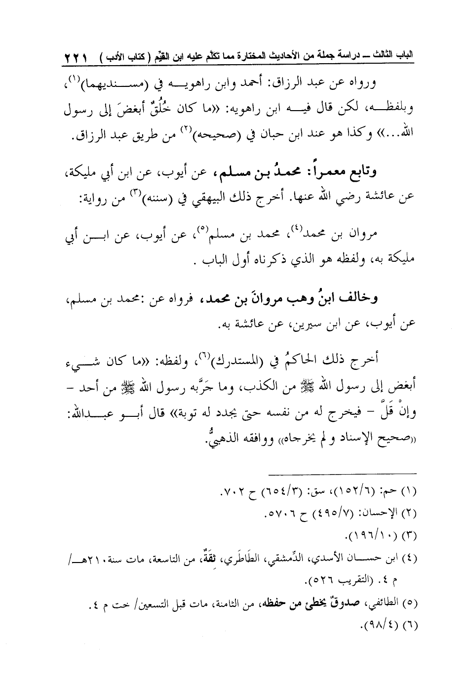 ورواه عن عبد الرزاق: أحمد وابن راهويه في (مسنديهما) 1، وبلفظه، لكن قال فيه ابن راهويه: "ما كان خُلُقٌ أبغضَ إلى رسول الله ... " وكذا هو عند ابن حبان في (صحيحه) 2 من طريق عبد الرزاق.