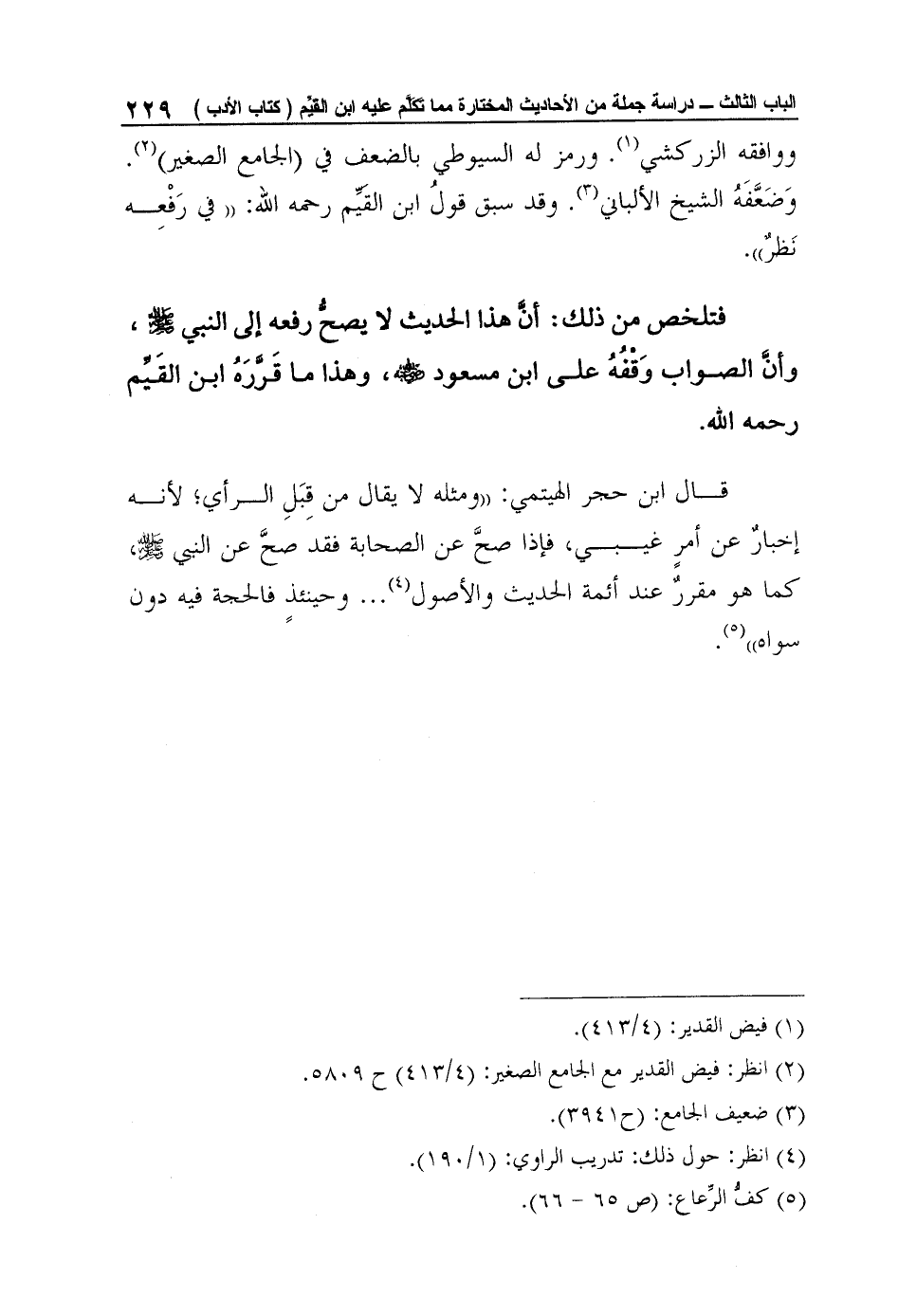 فتلخص من ذلك: أنَّ هذا الحديث لا يصحُّ رفعه إلى النبي صلى الله عليه وسلم، وأنَّ الصواب وَقْفُهُ على ابن مسعود رضي الله عنه، وهذا ما قَرَّرَهُ ابن القَيِّم رحمه الله.