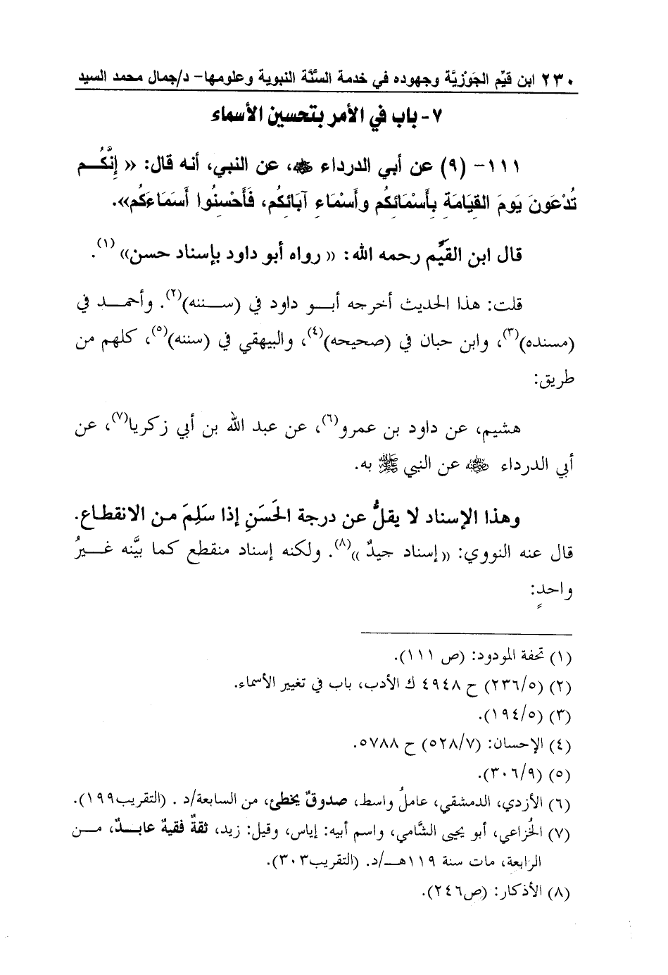111- (9) عن أبي الدرداء رضي الله عنه، عن النبي، أنه قال: "إِنَّكُم تُدْعَونَ يَومَ القِيَامَةِ بِأَسْمَائِكُم وأَسْمَاءِ آبَائِكُم، فَأَحْسِنُوا أَسَمَاءَكُم".