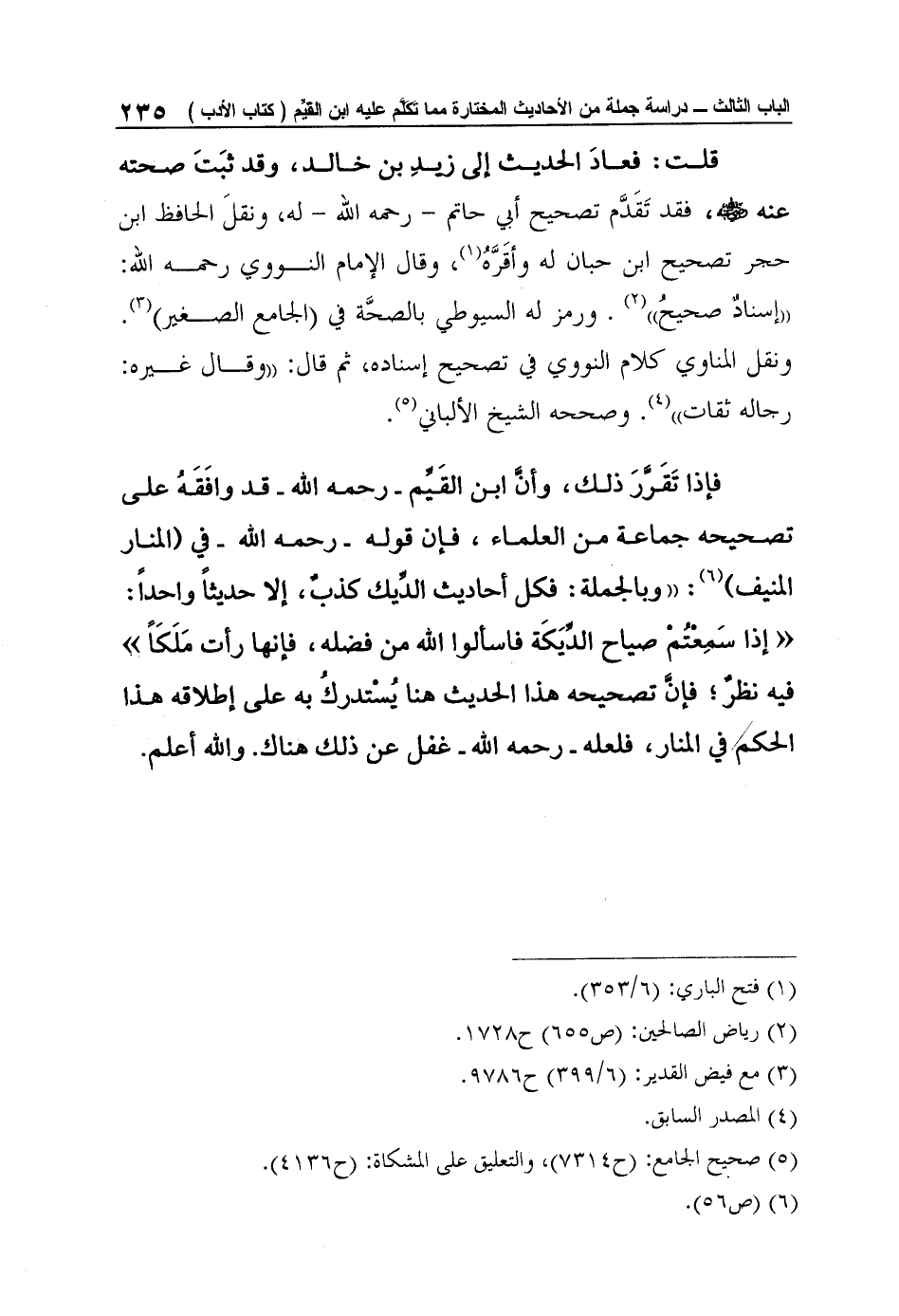 قلت: فعادَ الحديث إلى زيدِ بن خالد، وقد ثبَتَ صحته عنه رضي الله عنه، فقد تَقَدَّم تصحيح أبي حاتم - رحمه الله - له، ونقلَ الحافظ ابن حجر تصحيح ابن حبان له وأقَرَّهُ1، وقال الإمام النووي رحمه الله: "إسنادٌ صحيحُ"2. ورمز له السيوطي بالصحَّة في (الجامع الصغير) 3. ونقل المناوي كلام النووي في تصحيح إسناده، ثم قال: "وقال غيره: رجاله ثقات"4. وصححه الشيخ الألباني5.