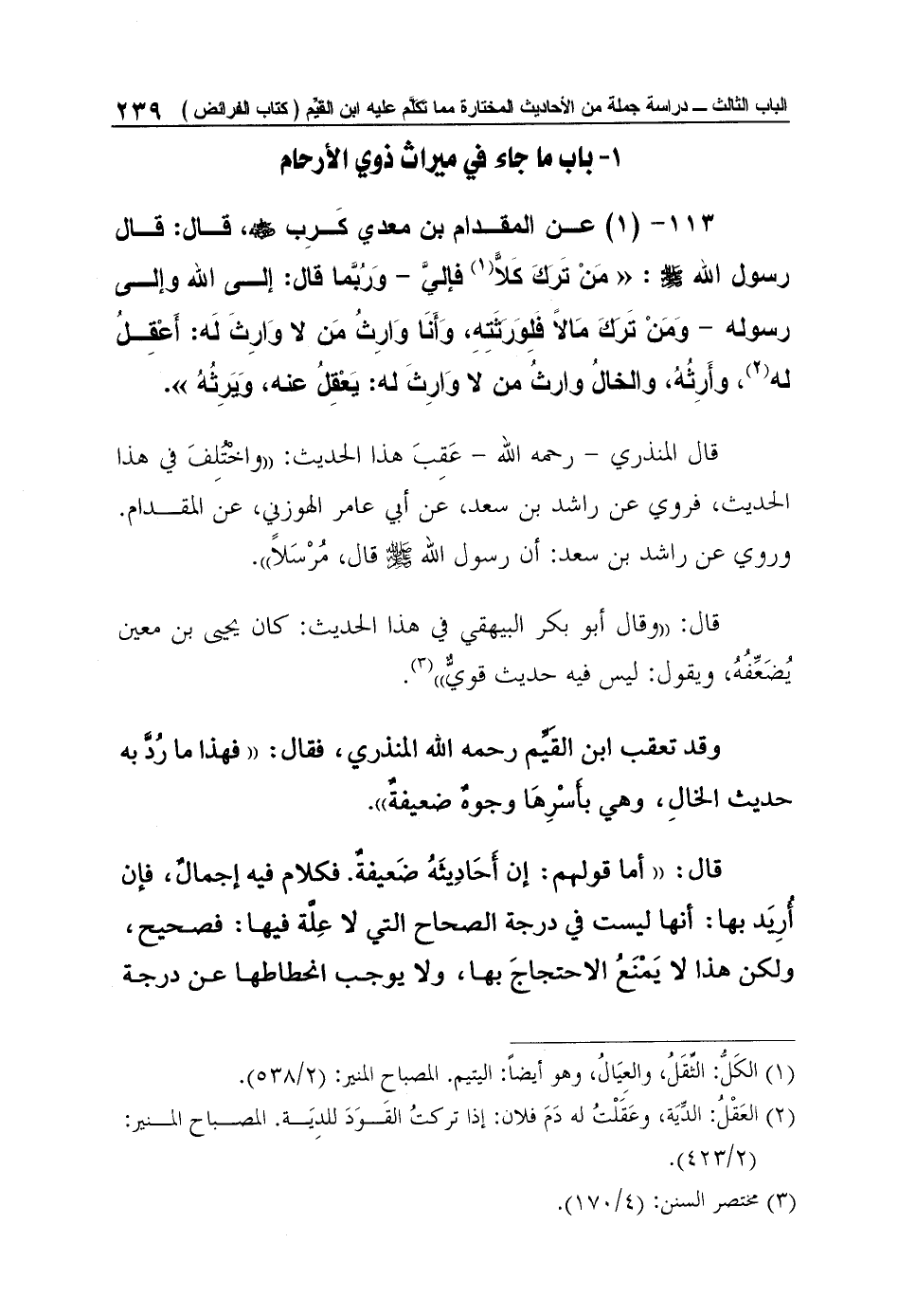 113- (1) عن المقدام بن معدي كَرِب رضي الله عنه، قال: قال رسول الله صلى الله عليه وسلم: "مَنْ تَرَكَ كَلاًّ1 فإليَّ - وَرُبَّما قال: إلى الله وإلى رسوله - وَمَنْ تَرَكَ مَالاً فَلِوَرَثَتِهِ، وَأَنَا وَارِثُ مَن لا وَارِثَ لَه: أَعْقِلُ له2، وأَرِثُهُ، والخالُ وارثُ من لا وَارِثَ له: يَعْقِلُ عنه، وَيَرِثُهُ ".